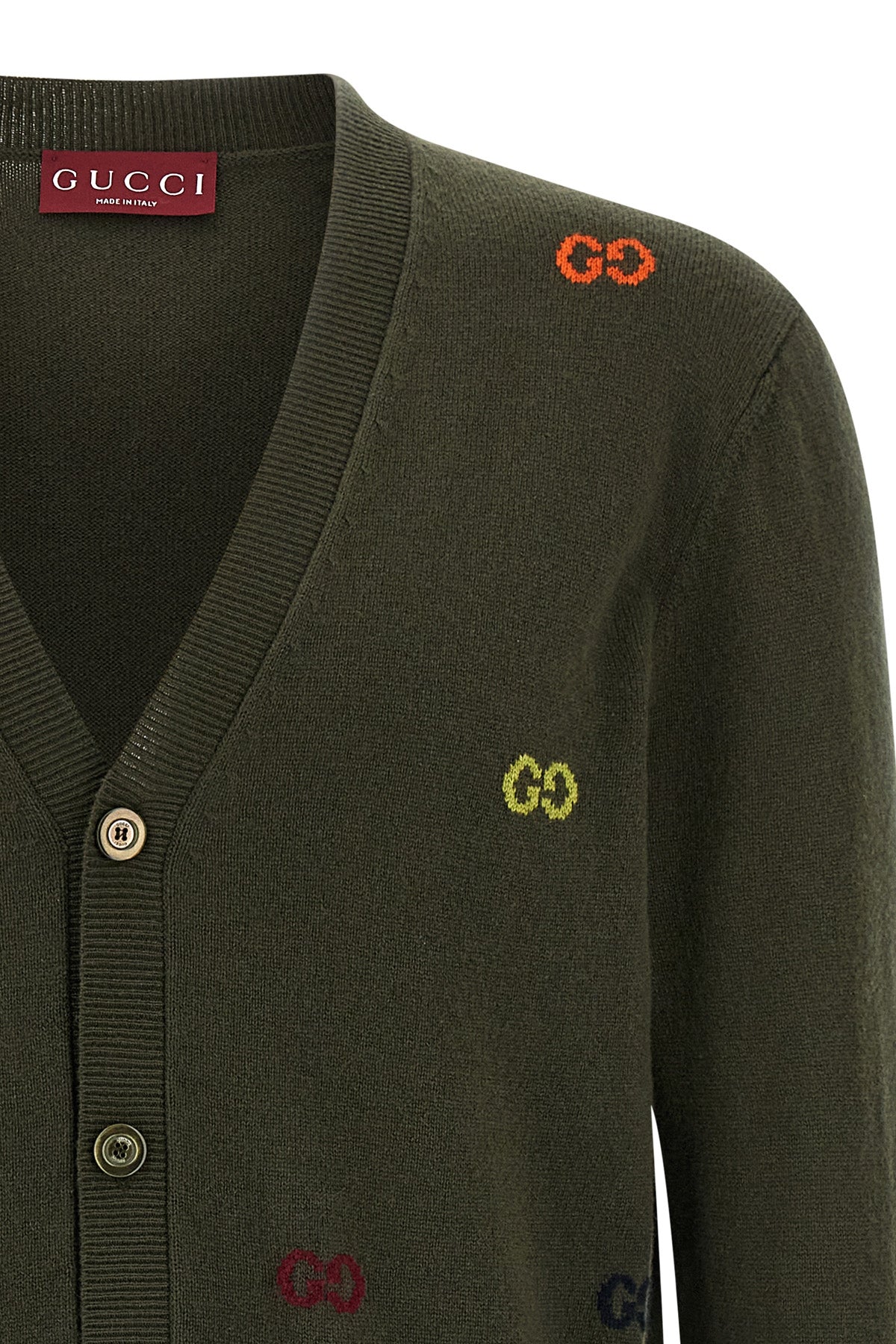 Gilet en cachemire fin avec motif intarsia multicolore à motif GG, col en V, fermeture boutonnée sur le devant, poches, manches longues à poignets boutonnés.