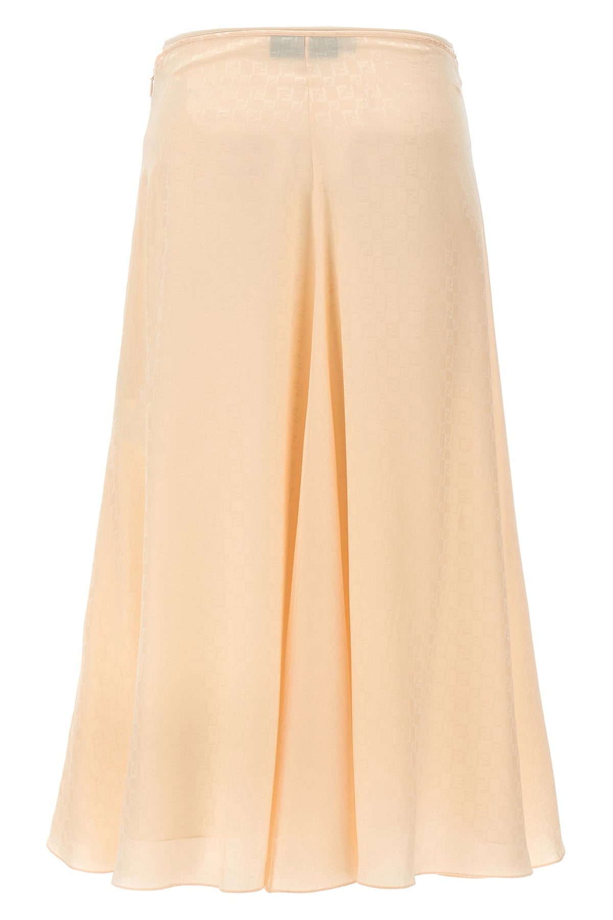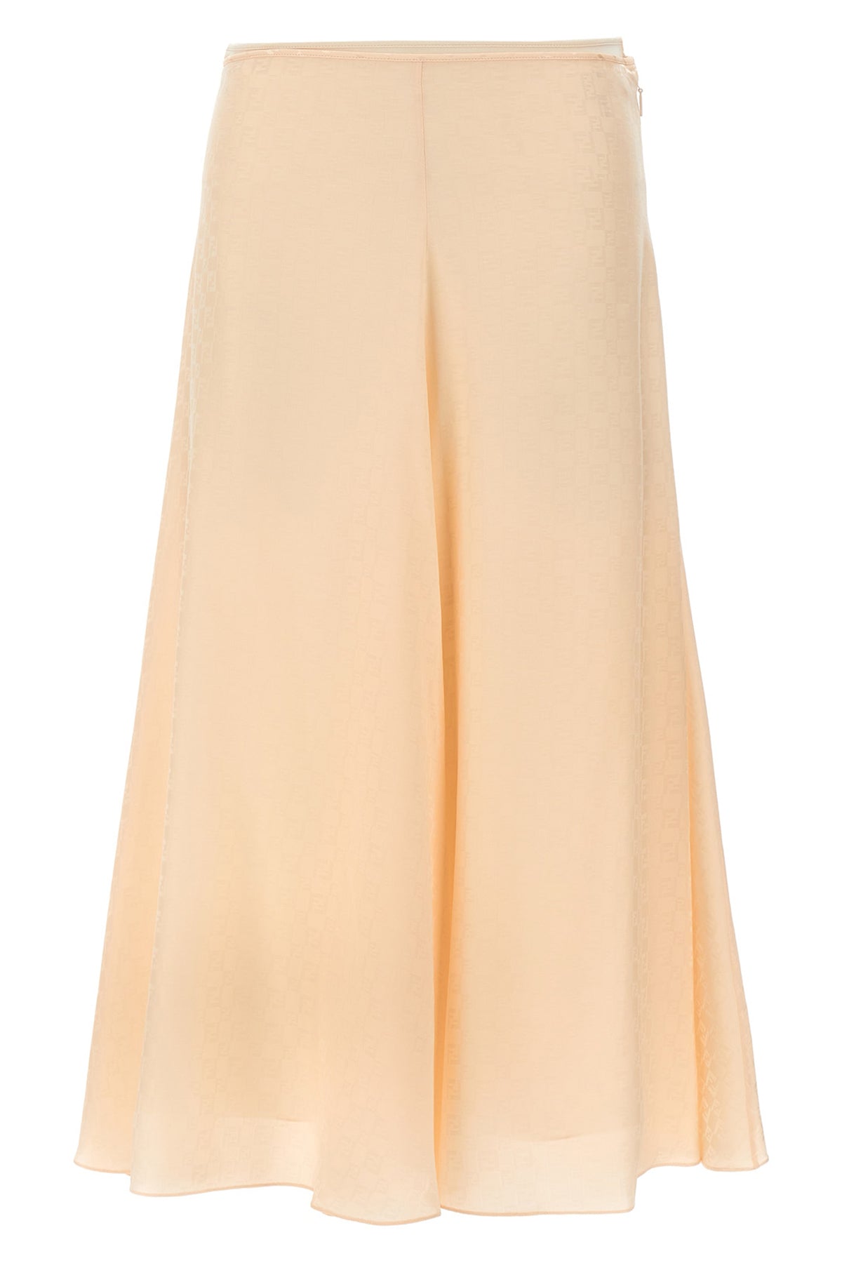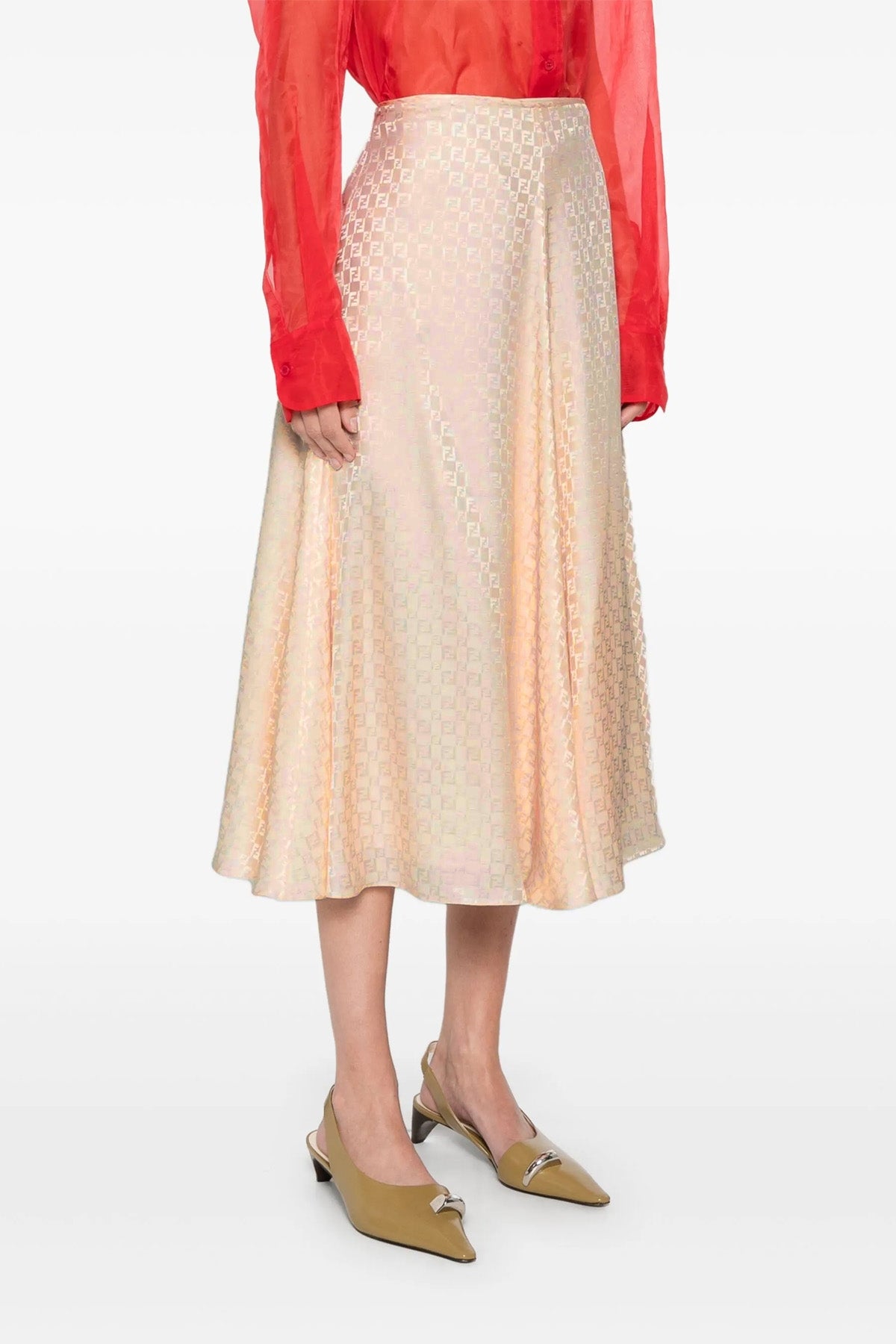 Jupe midi en soie jacquard à motif damier, coupe évasée, fermeture éclair sur le côté.