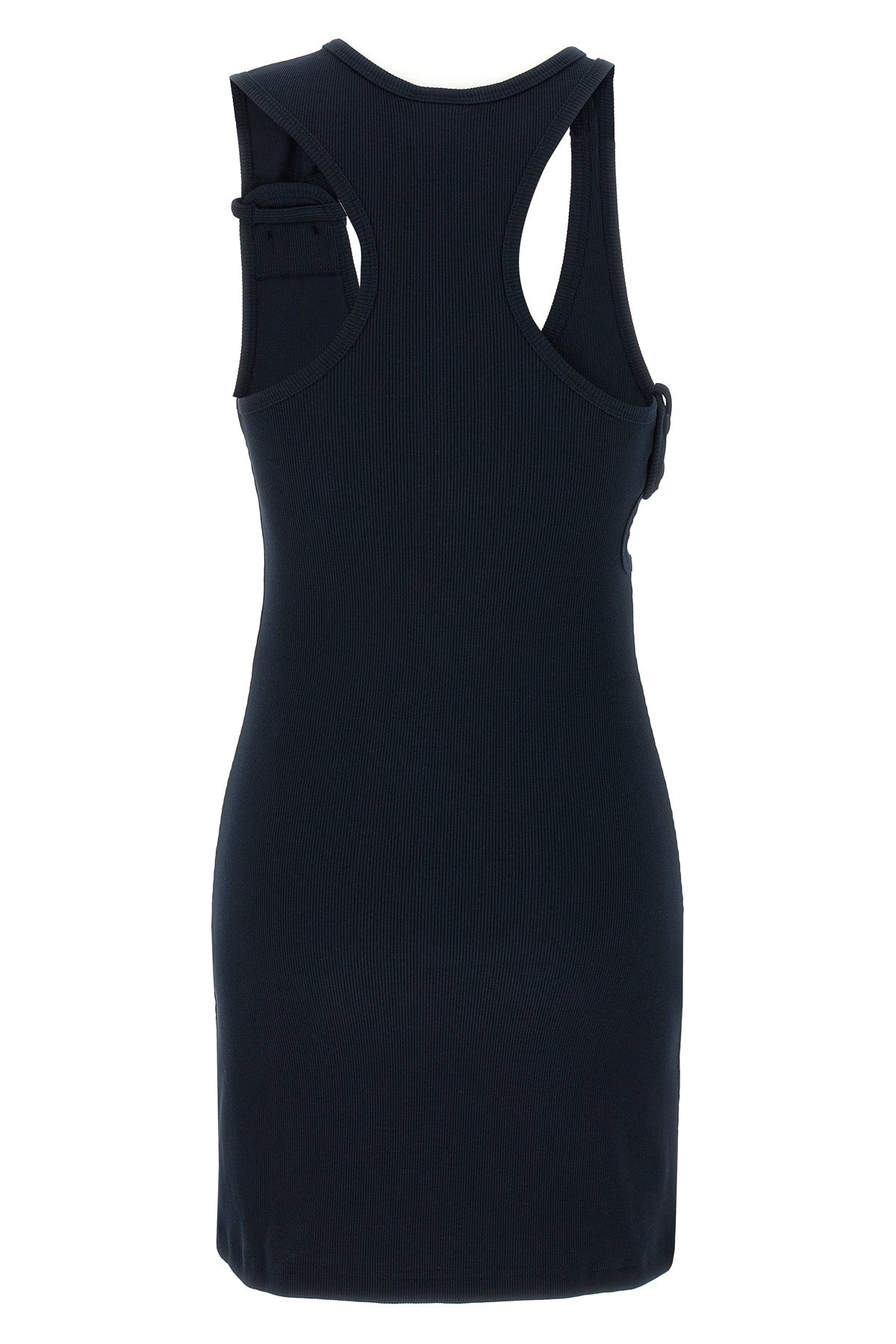 Robe en coton stretch côtelé Double Bucklee années 90 avec détail de bouton découpé sur le côté, écusson logo ton sur ton sur le devant, encolure ronde, bretelles.