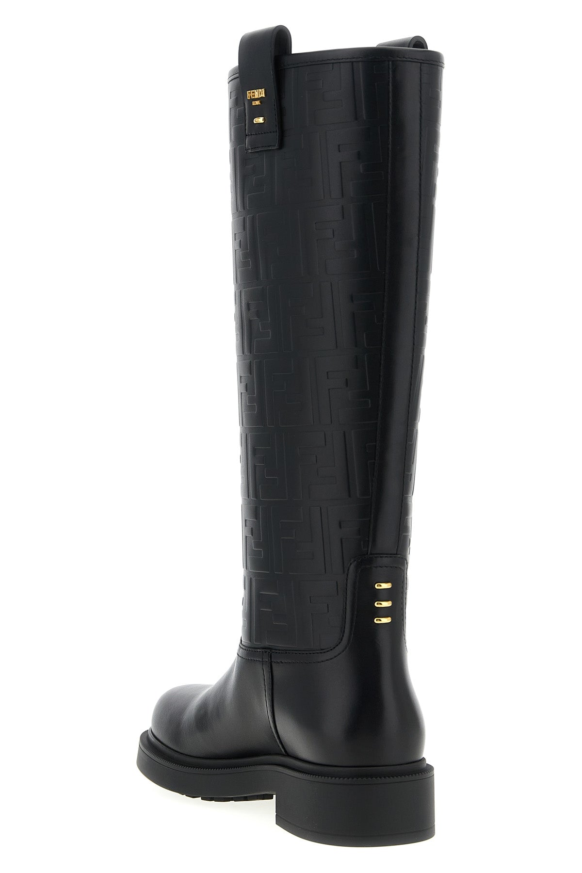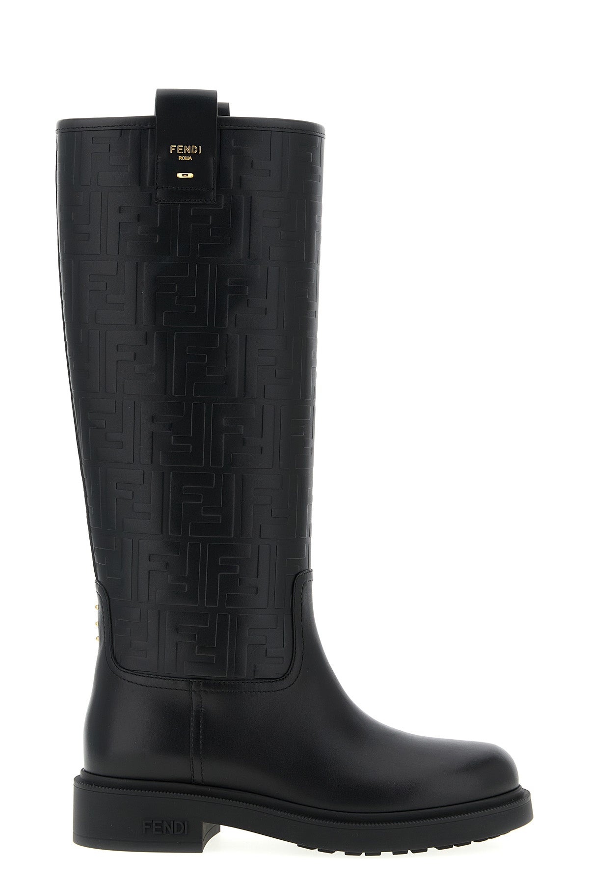 Bottes Fendi Filo' en cuir, tige tube avec motif FF iconique estampé à chaud en relief, surpiqûres métalliques Selleria et logo Fendi Roma en lettres métalliques, semelle et talon en caoutchouc.