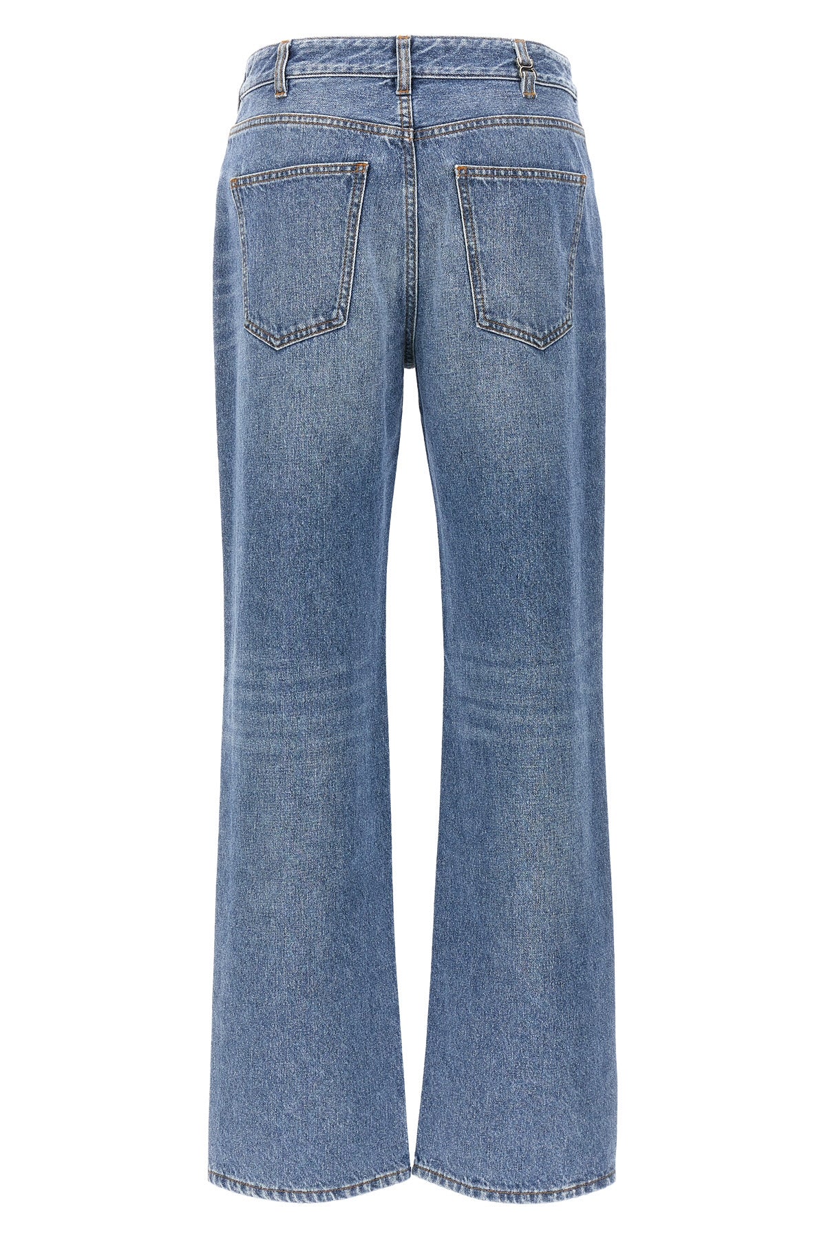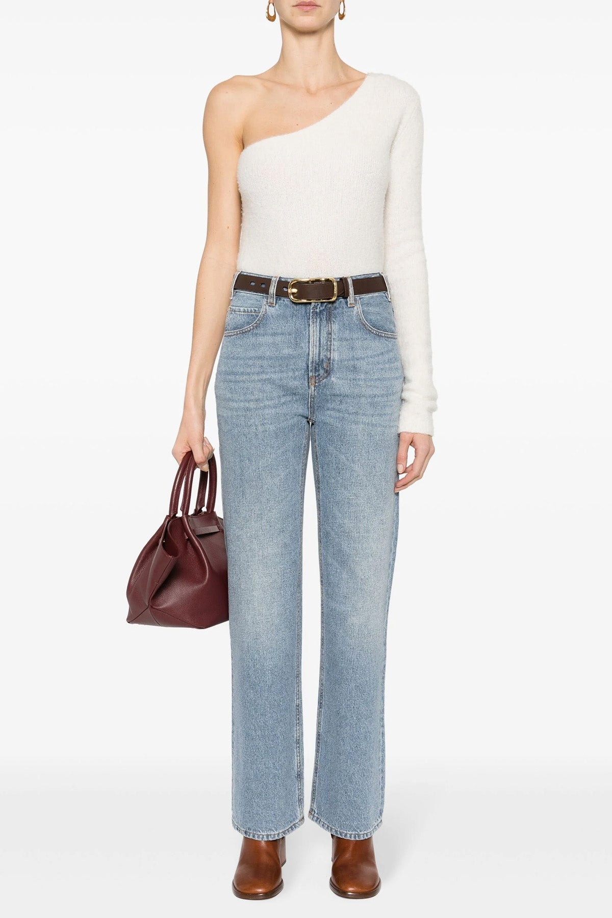 Jean en denim, modèle taille haute à 5 poches avec fermeture éclair et bouton, jambes larges.