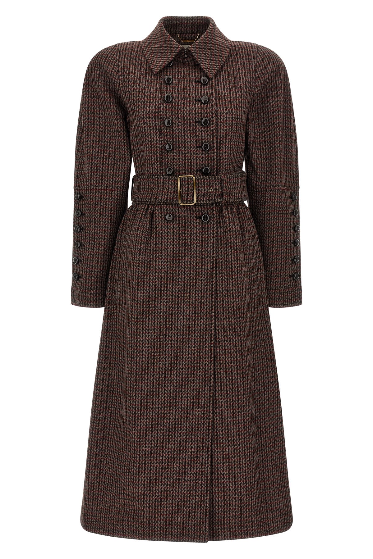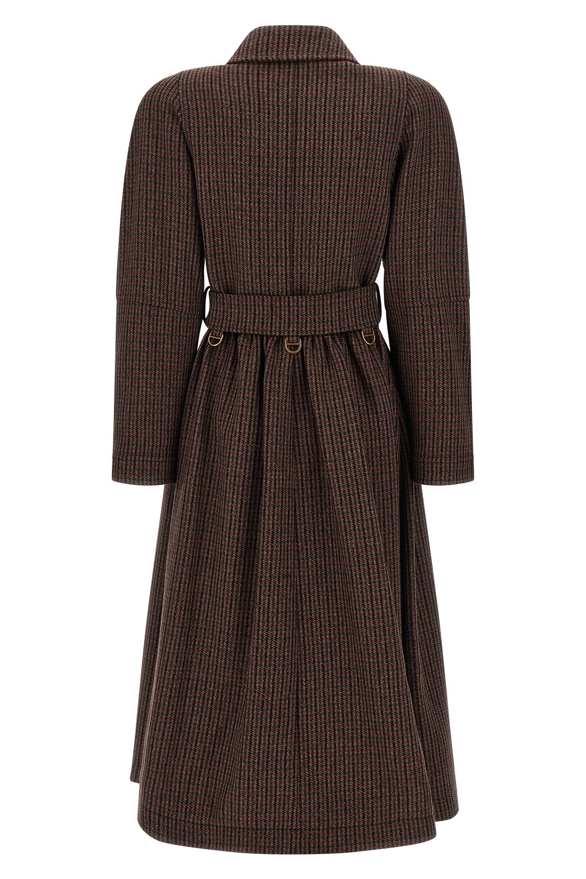 Manteau d'équitation en laine à double boutonnage, style pied-de-poule, fermeture boutonnée sur le devant, col chemise, poches, épaules rembourrées, manches longues avec boutons aux poignets, ceinture amovible, doublure en mélange de viscose et de coton.