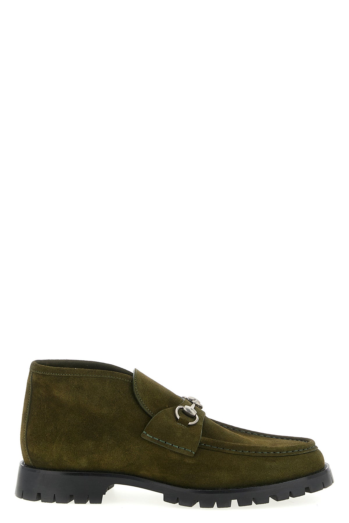 Bottines en daim, détail de bride métallique à l'avant, semelle en caoutchouc.