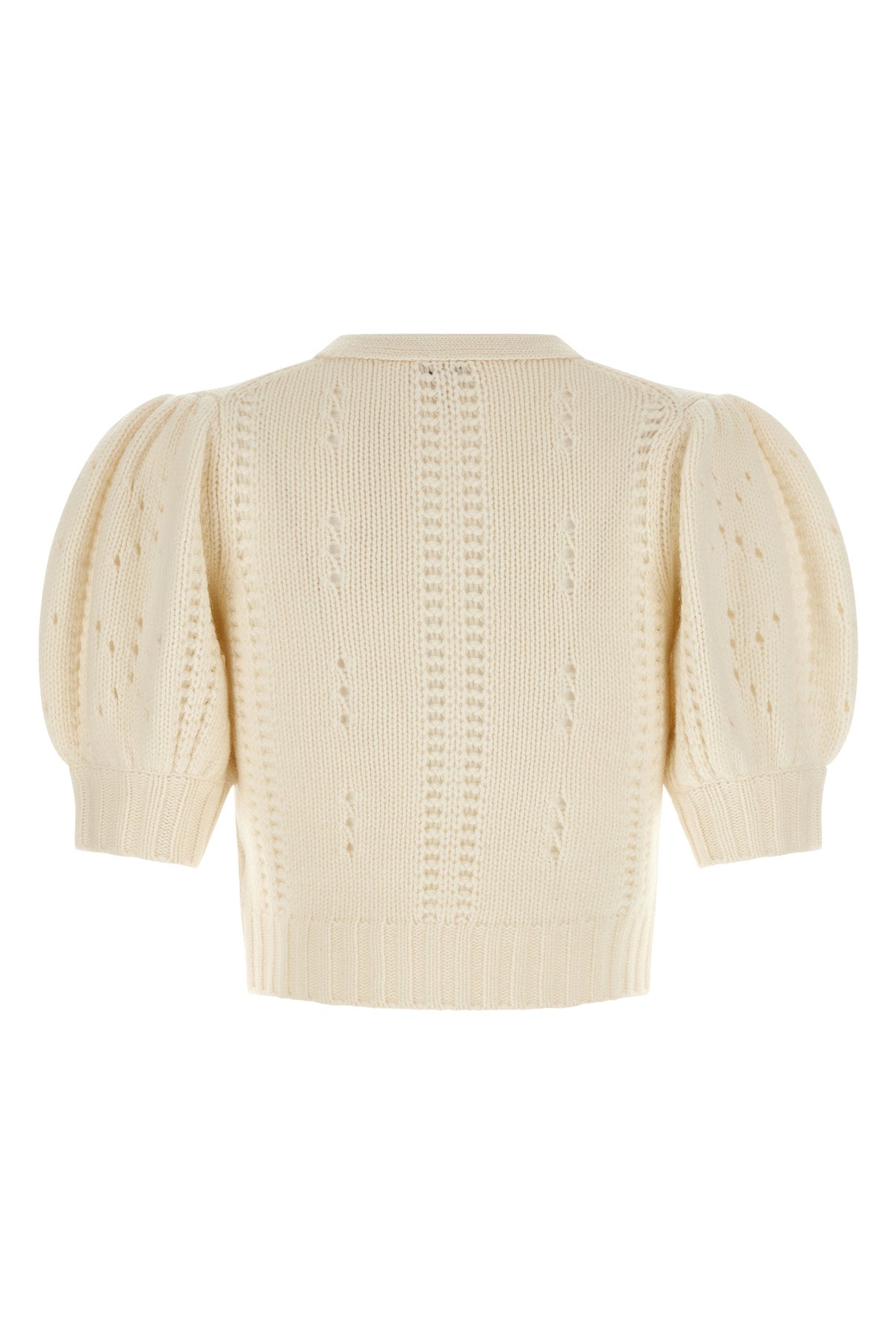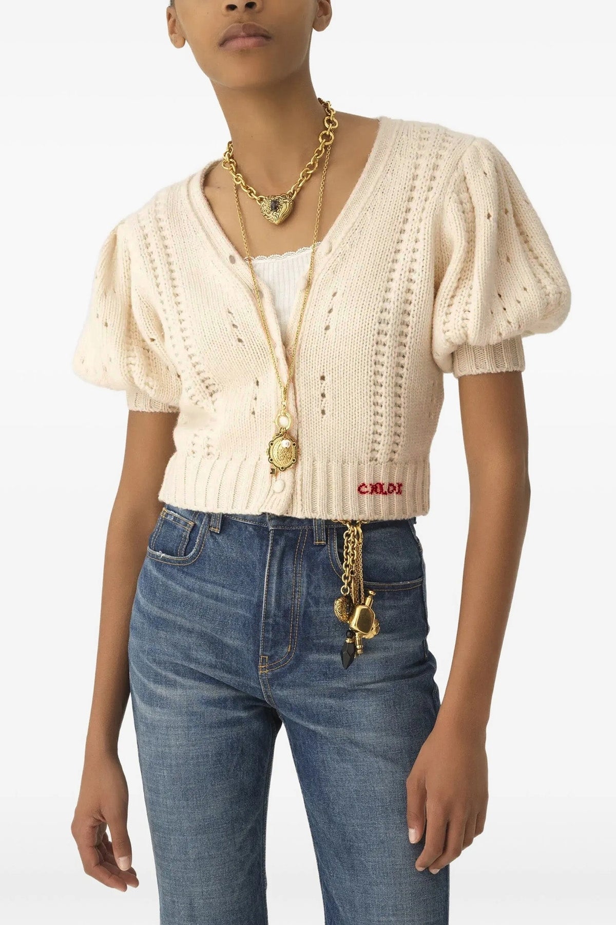 Gilet court en laine et cachemire à maille épaisse, orné d'un motif perforé et d'un logo jacquard sur le devant, col en V, fermeture boutonnée sur le devant, manches courtes bouffantes avec poignets.