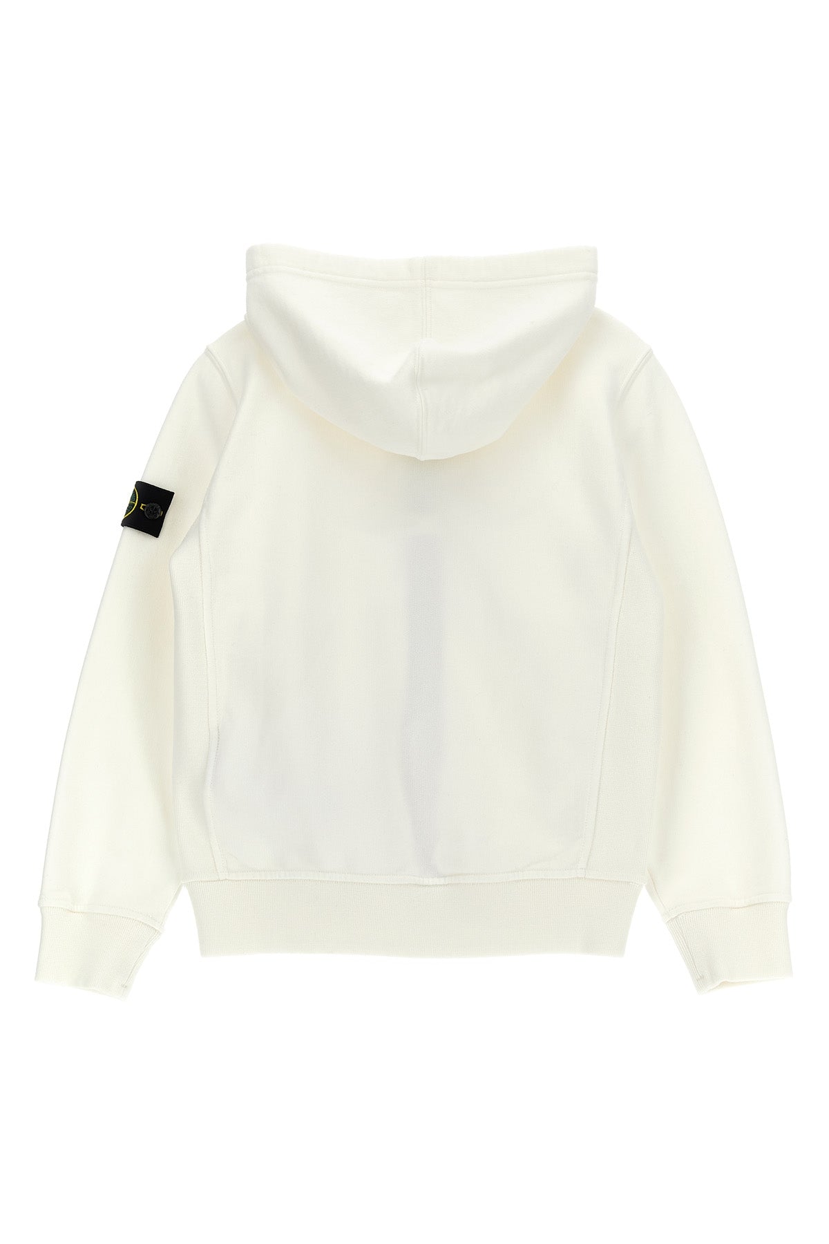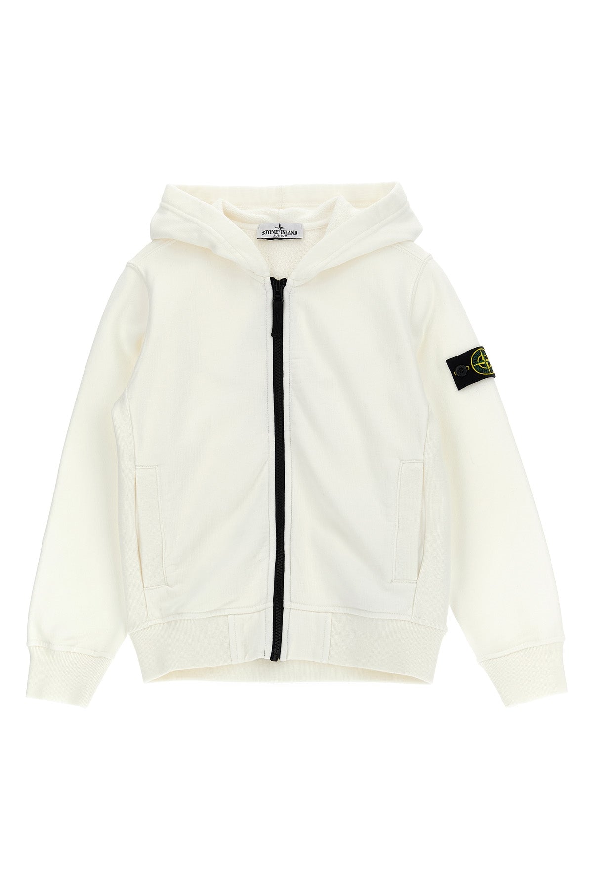 Sweat à capuche en coton légèrement polaire avec fermeture éclair sur le devant, poches, manches longues à revers et écusson logo.