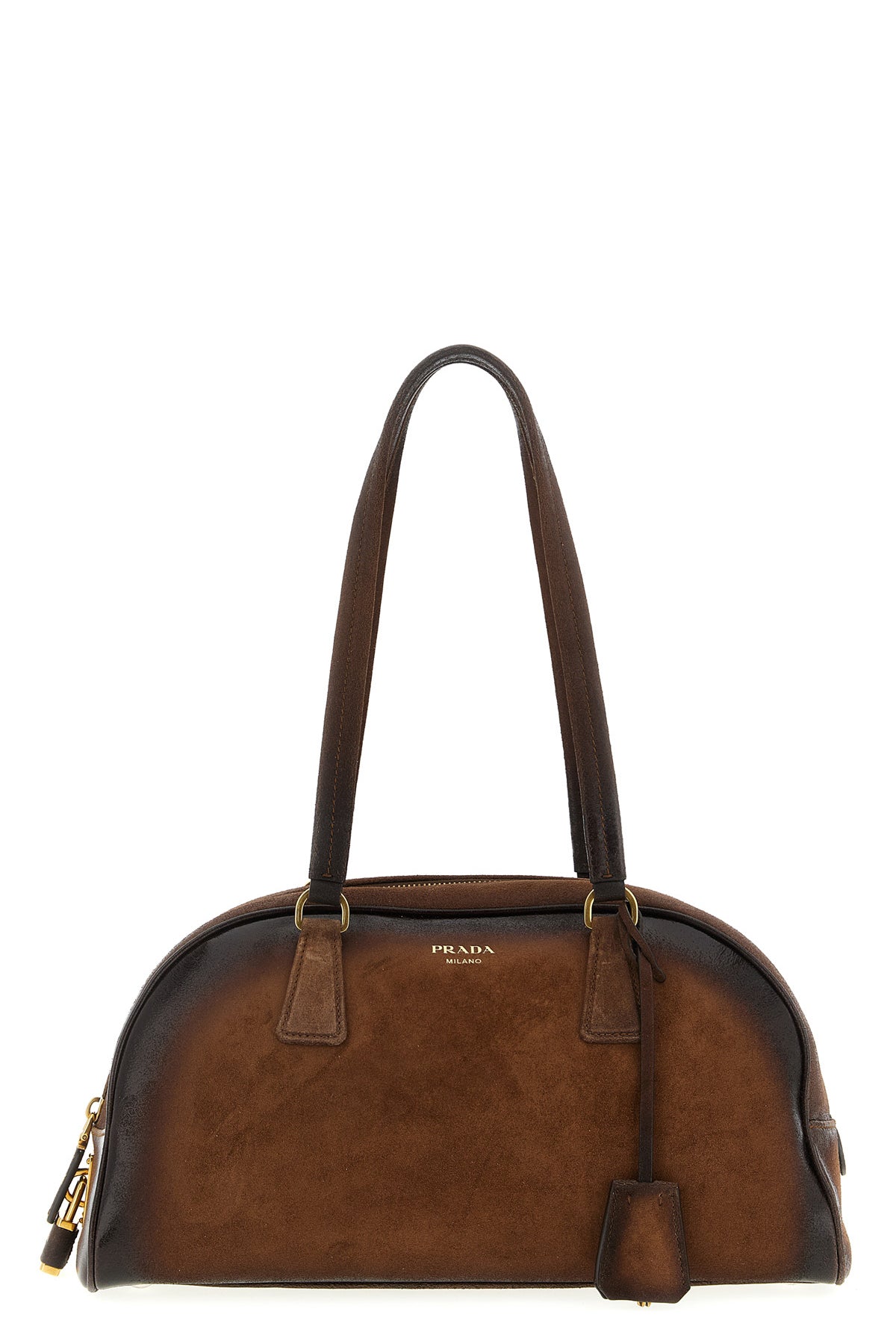 Étui à bagages moyen ' Prada Bowling ' en daim, confectionné à la main pour un effet vieilli, logo embossé sur le devant, fermeture éclair sur le dessus avec détail de cadenas en métal, double poignée fixe, base rigide avec pieds en métal, anneau porte-clés amovible.