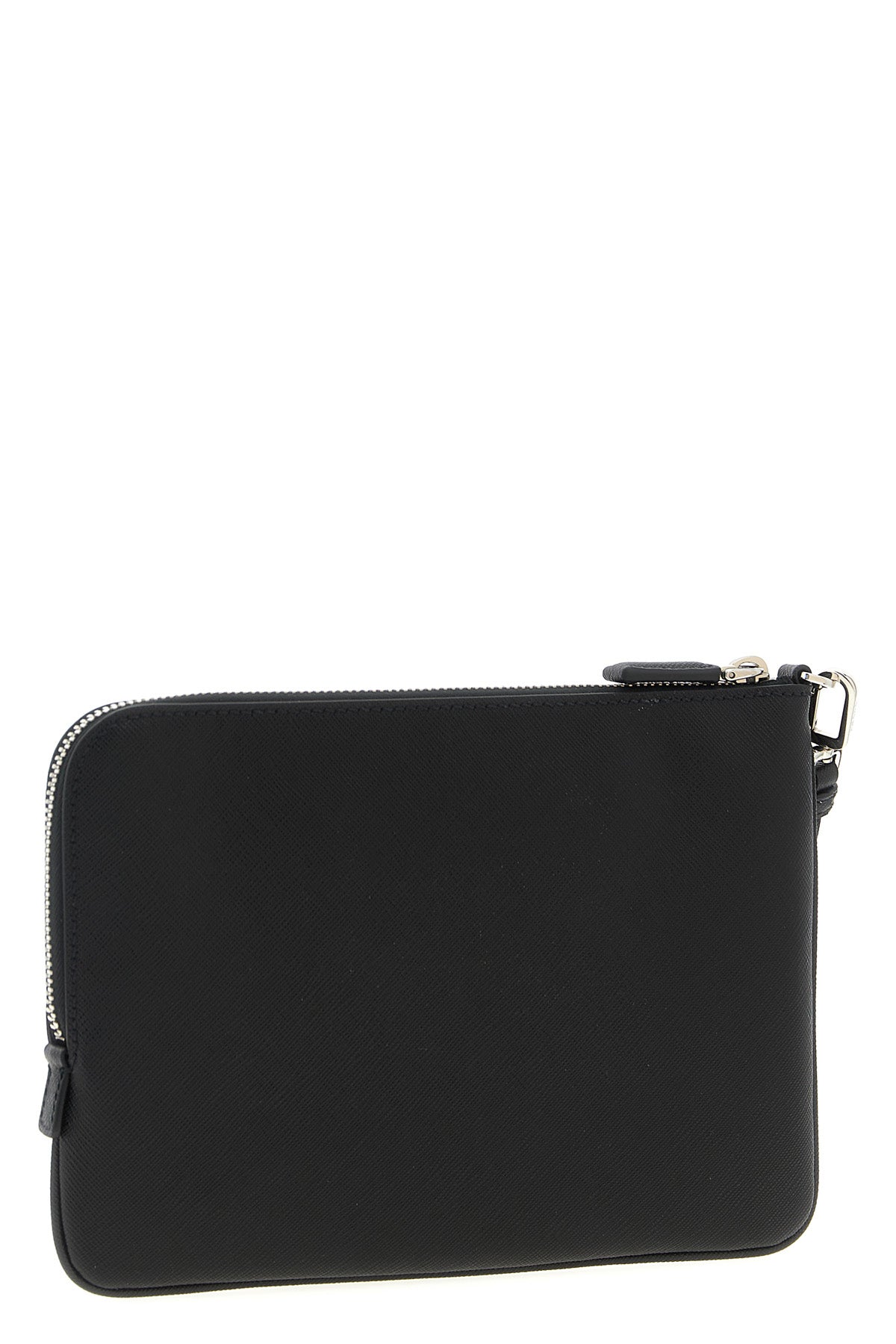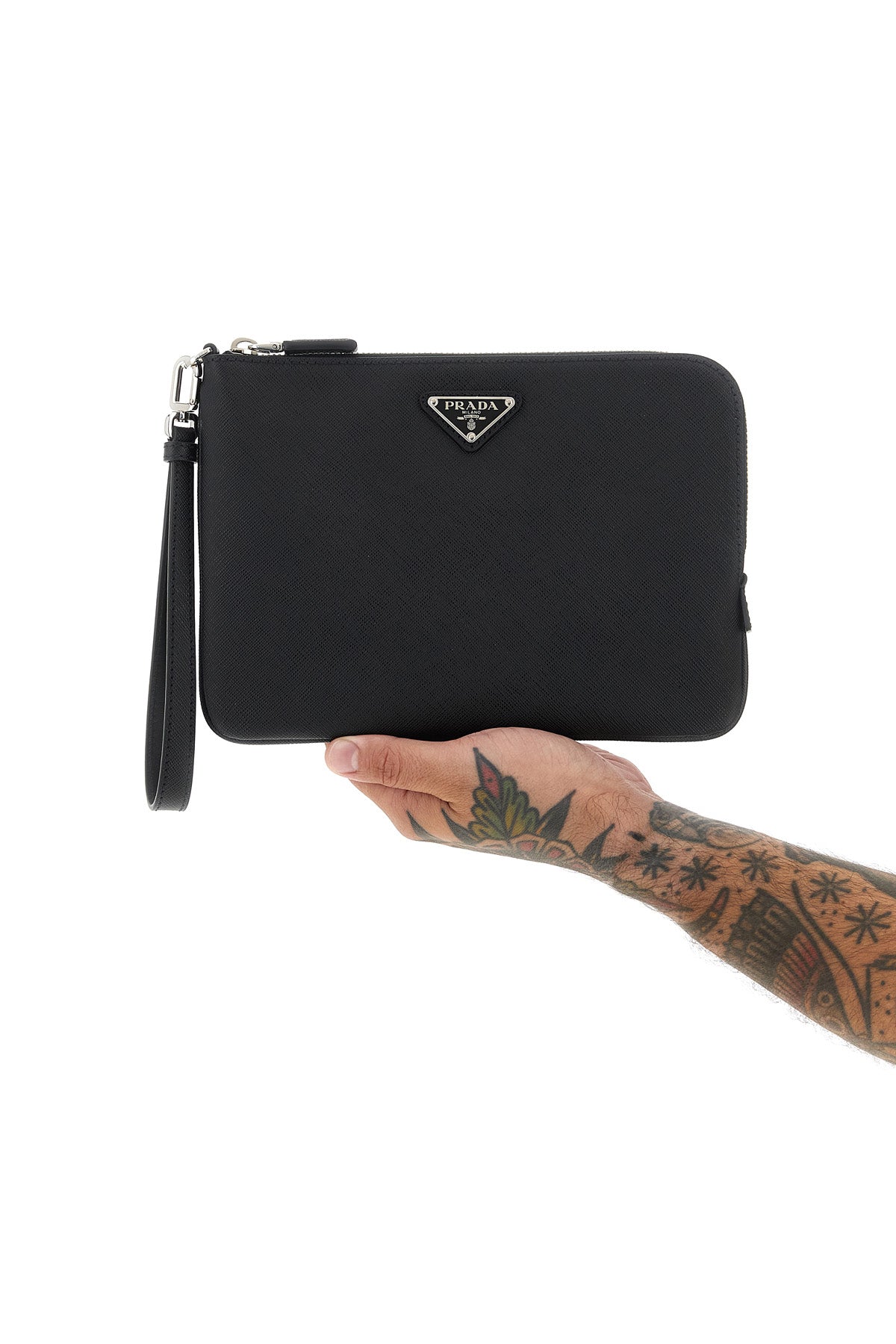 Pochette en cuir Saffiano, logo triangulaire en métal émaillé sur le devant, fermeture zippée sur le dessus, poignée de poignet amovible.