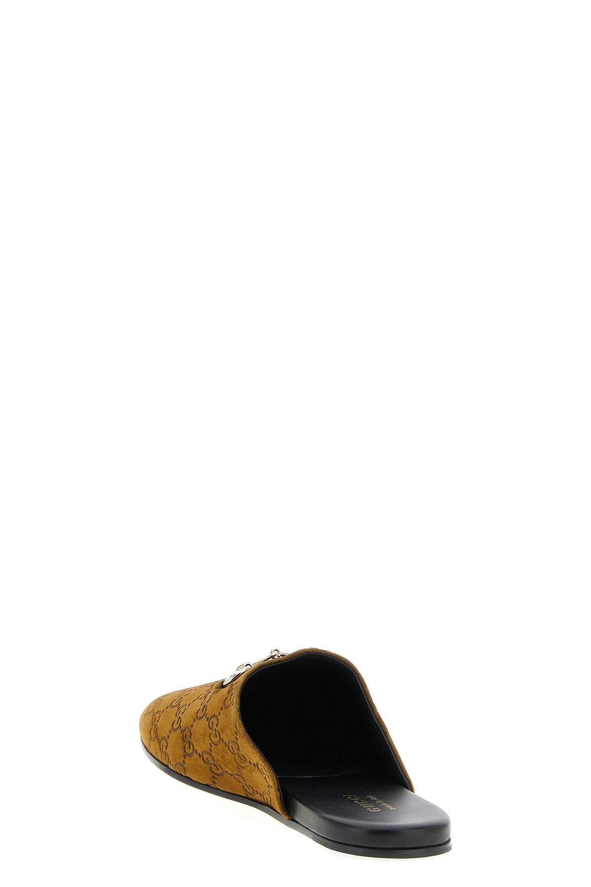 Sabots en daim GG, détail de bride métallique à l'avant, bout arrondi et semelle en cuir.