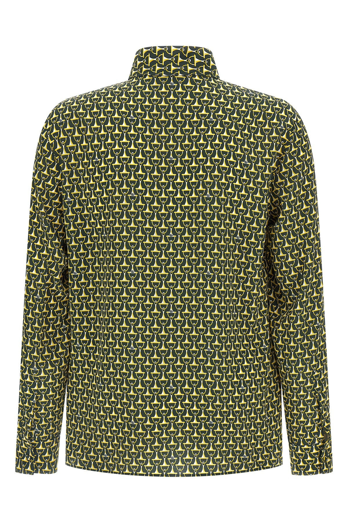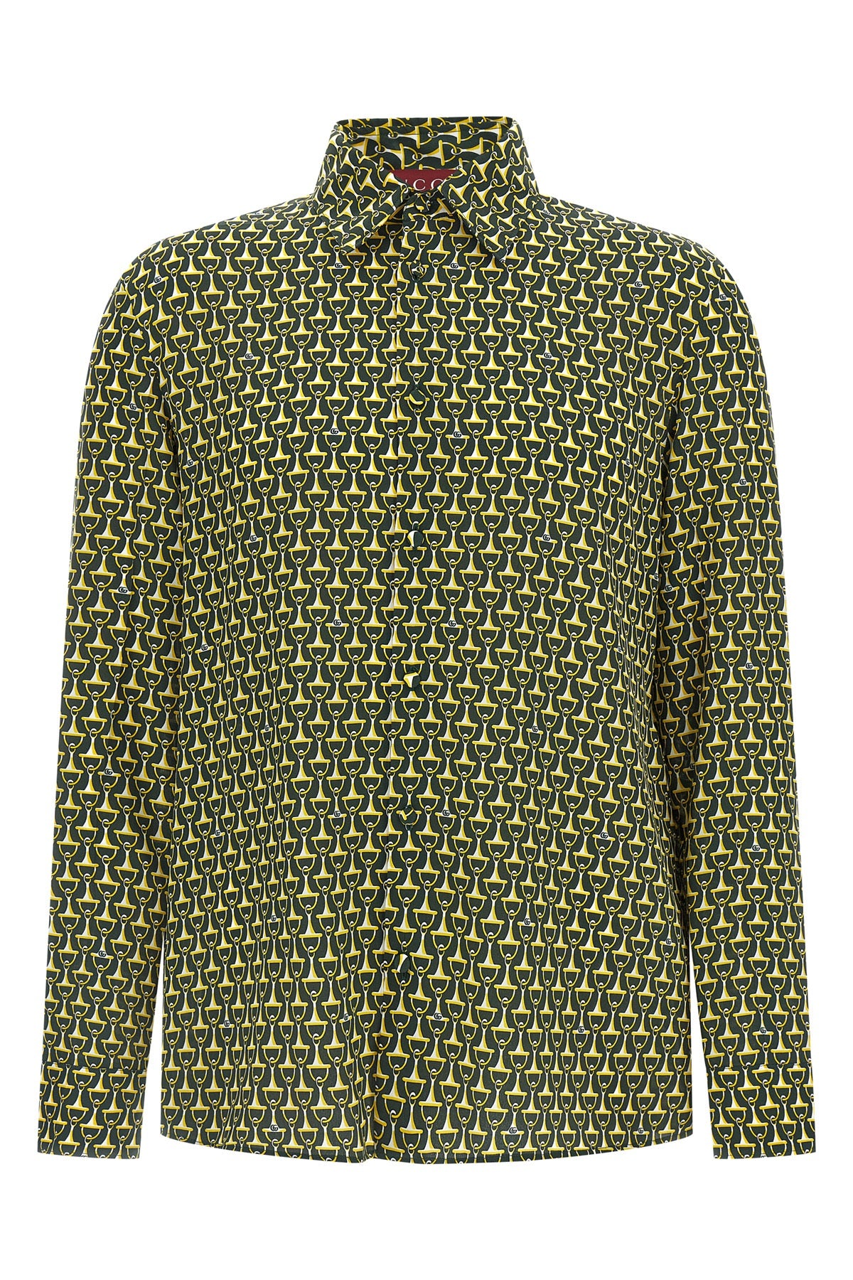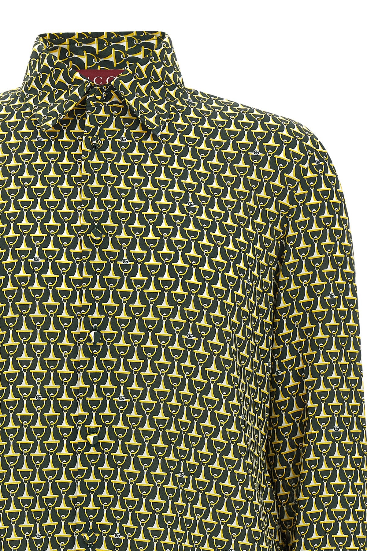 Chemise en crêpe de Chine imprimée en soie, motif mors sur toute la surface, col pointu, fermeture boutonnée sur le devant, manches longues à poignets boutonnés, fentes latérales.