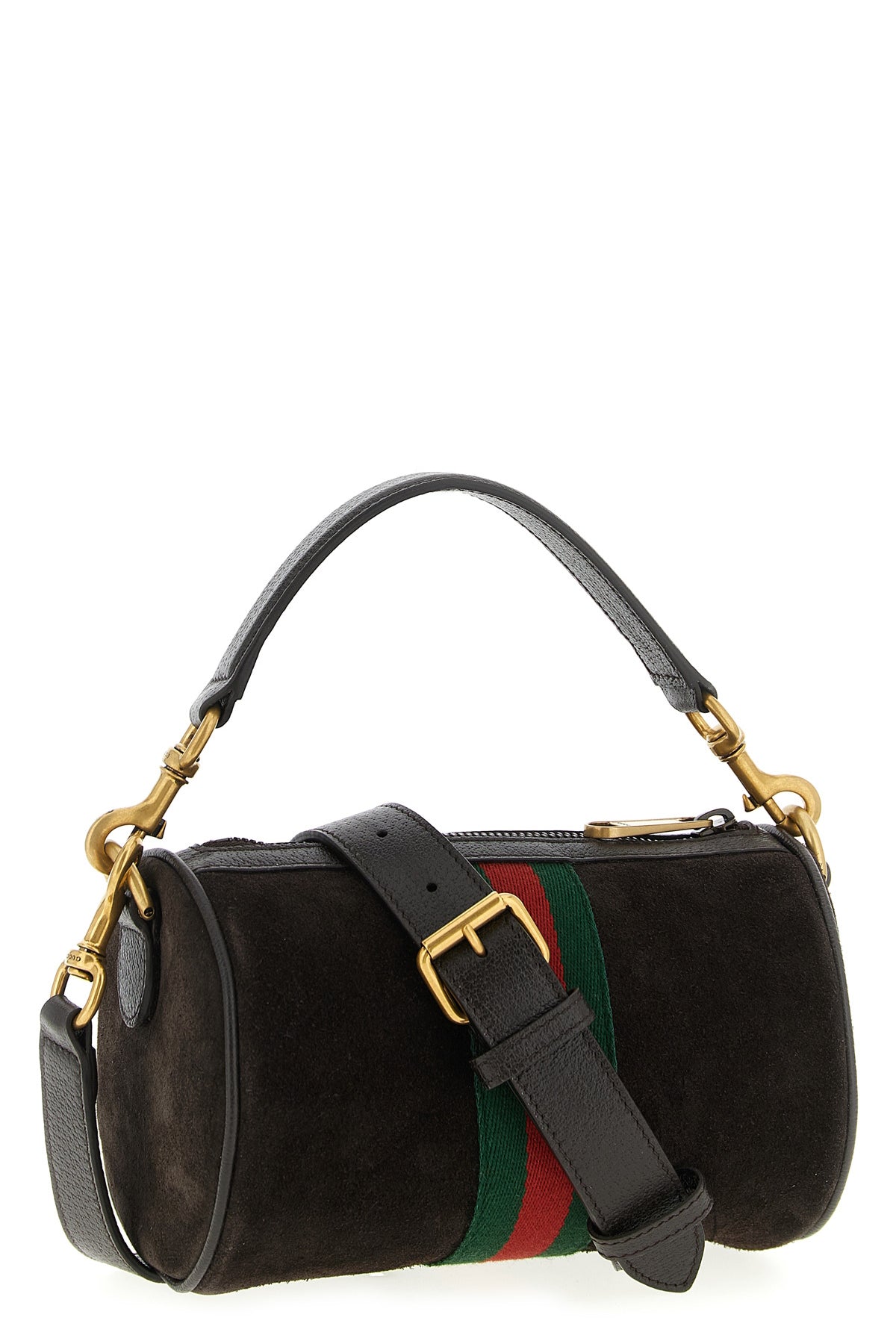 Sac à main Ophidia Mini en daim et cuir lisse, ruban Web central et détail double G en métal vieilli sur le devant, fermeture éclair sur le dessus, poignée amovible, bandoulière réglable et amovible.