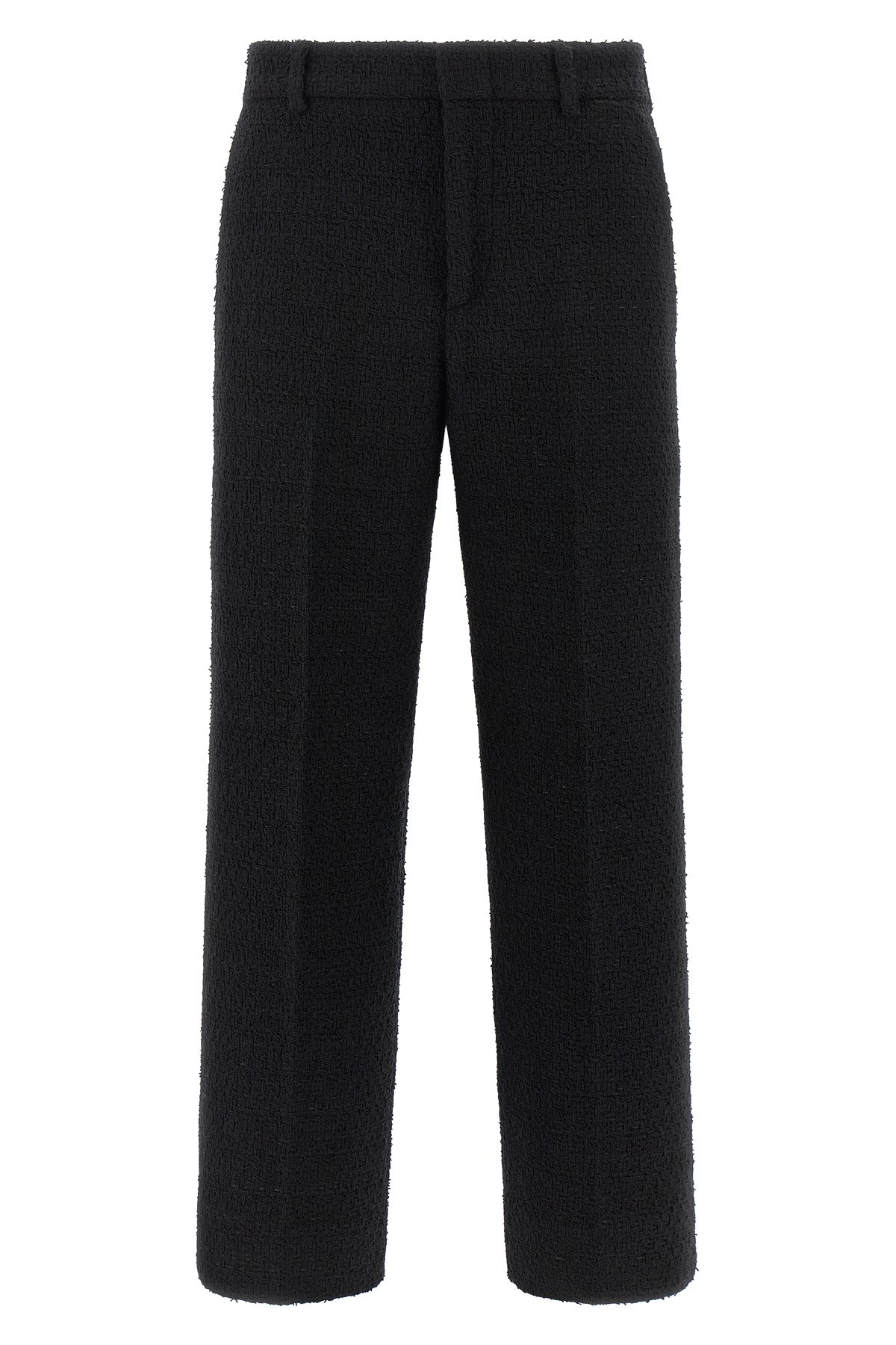 Pantalon en laine bouclée, non doublé, à plis étirés, jambe droite, fermeture éclair et bouton sur le devant, poches.