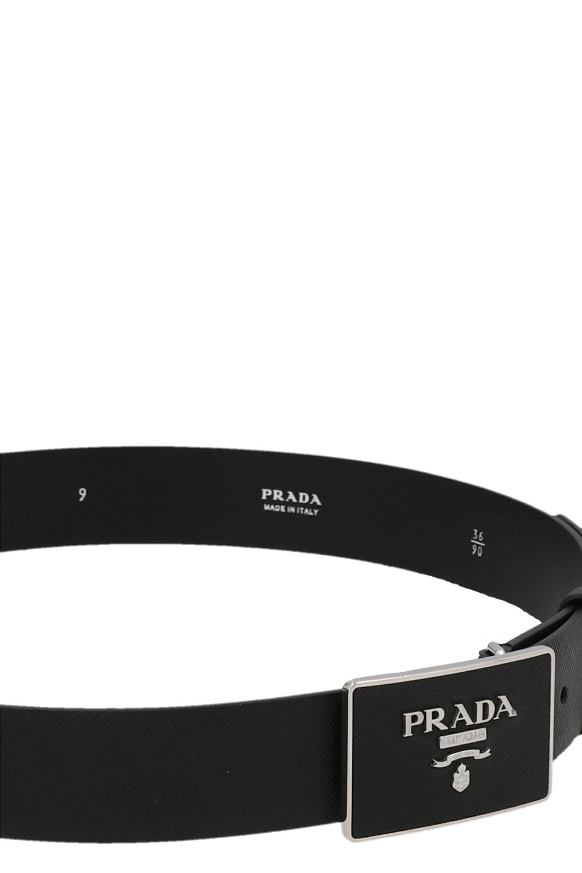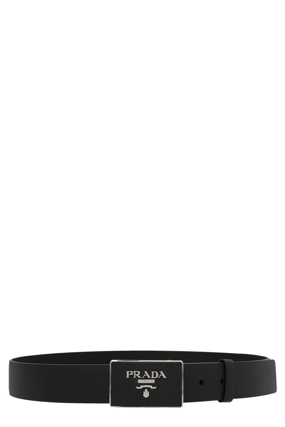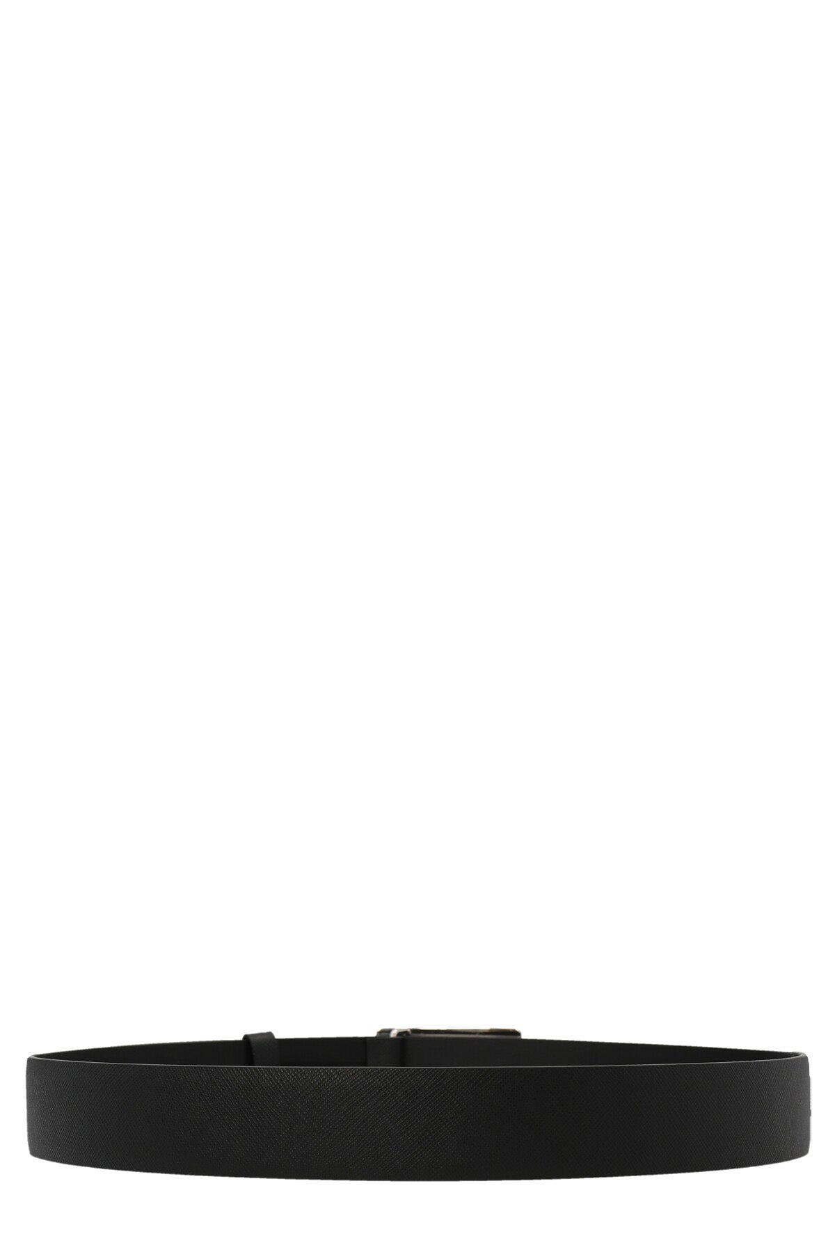 Ceinture en cuir Saffiano avec plaque logo sur le devant.