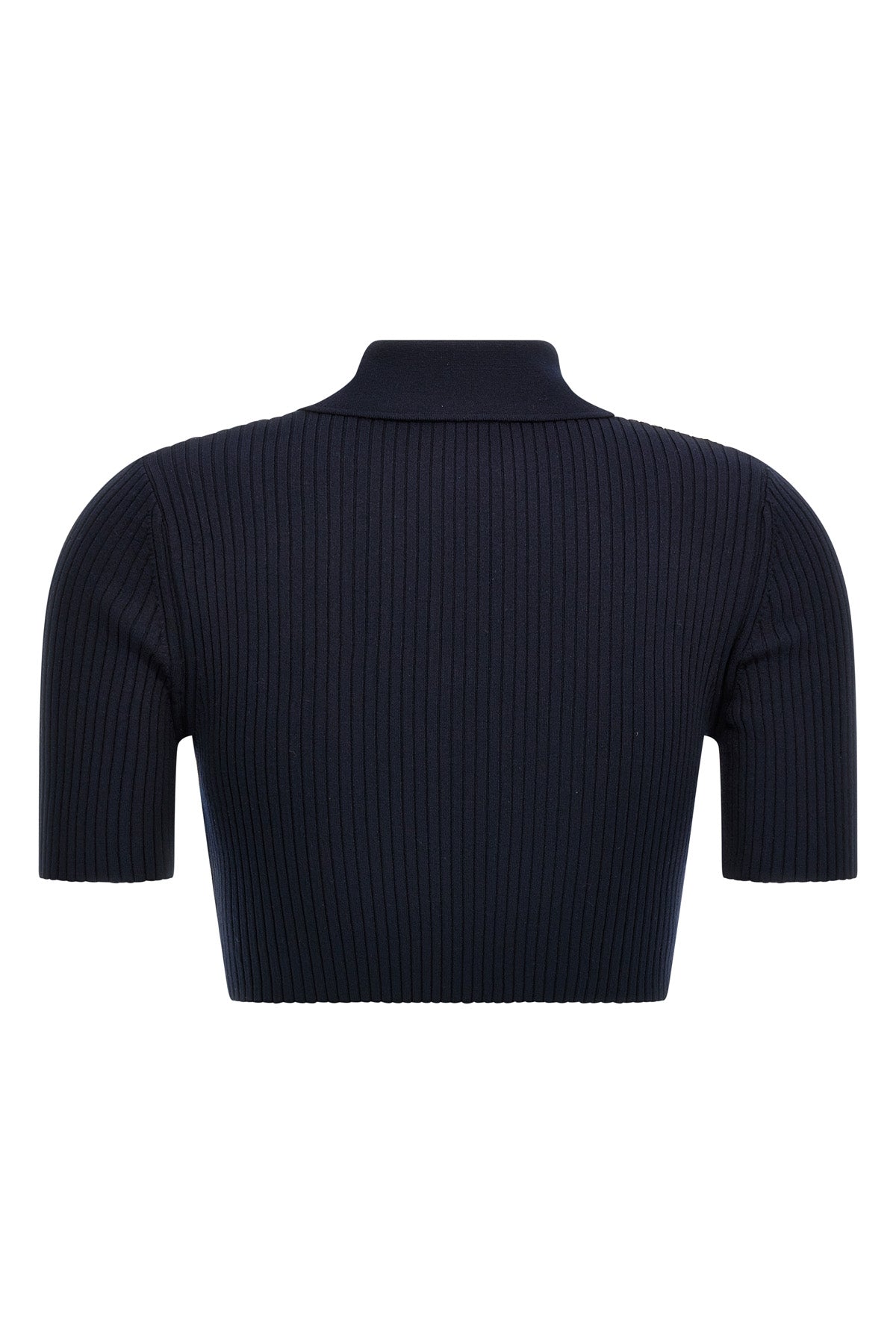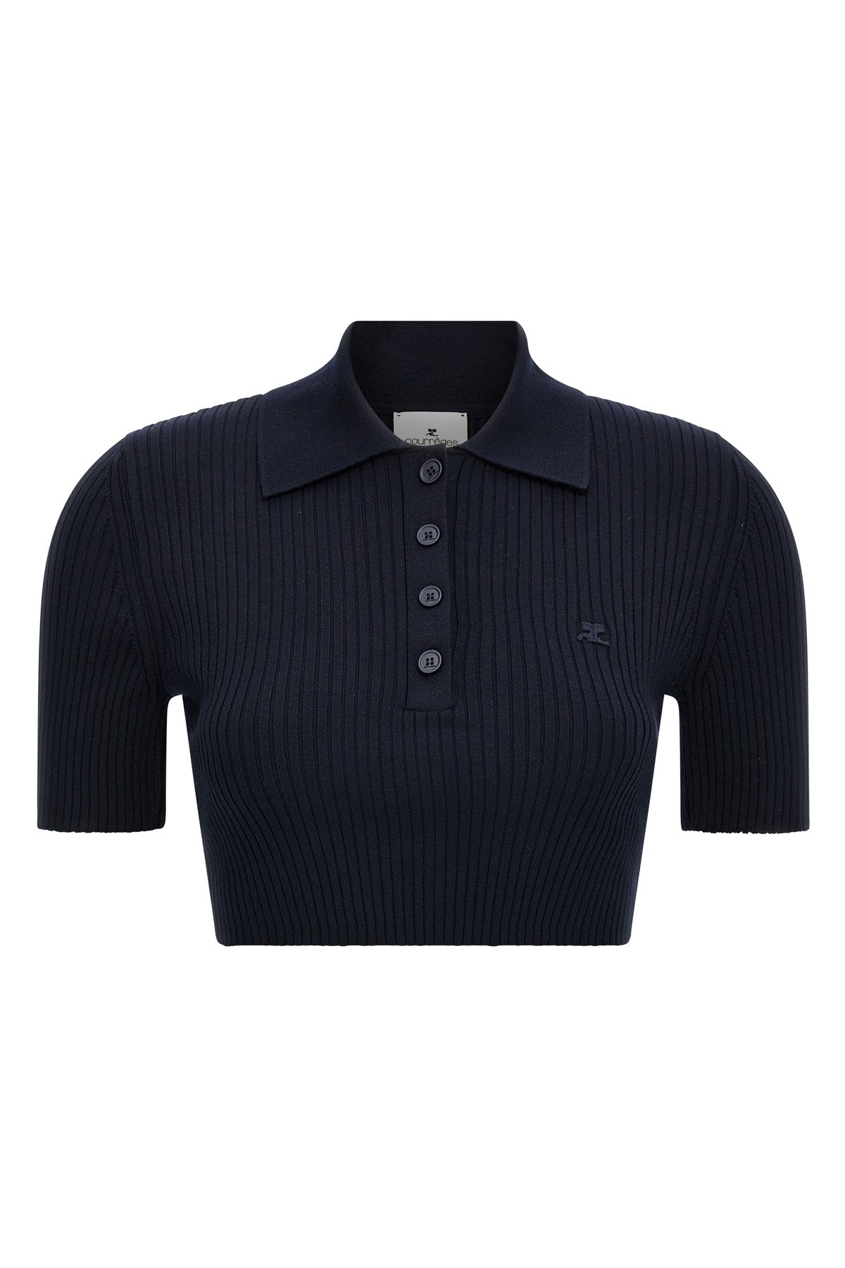Polo en viscose côtelée extensible, coupe courte, logo ton sur ton sur le devant, col et boutons, manches courtes, ourlet brut.