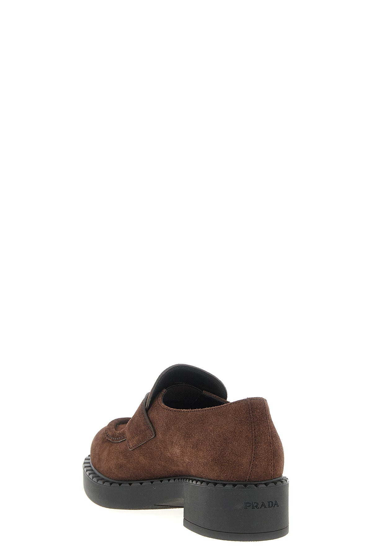 Mocassins en daim couleur chocolat avec logo triangulaire en métal émaillé sur le devant, trépointe en caoutchouc moulé crantée, semelle monobloc en caoutchouc.