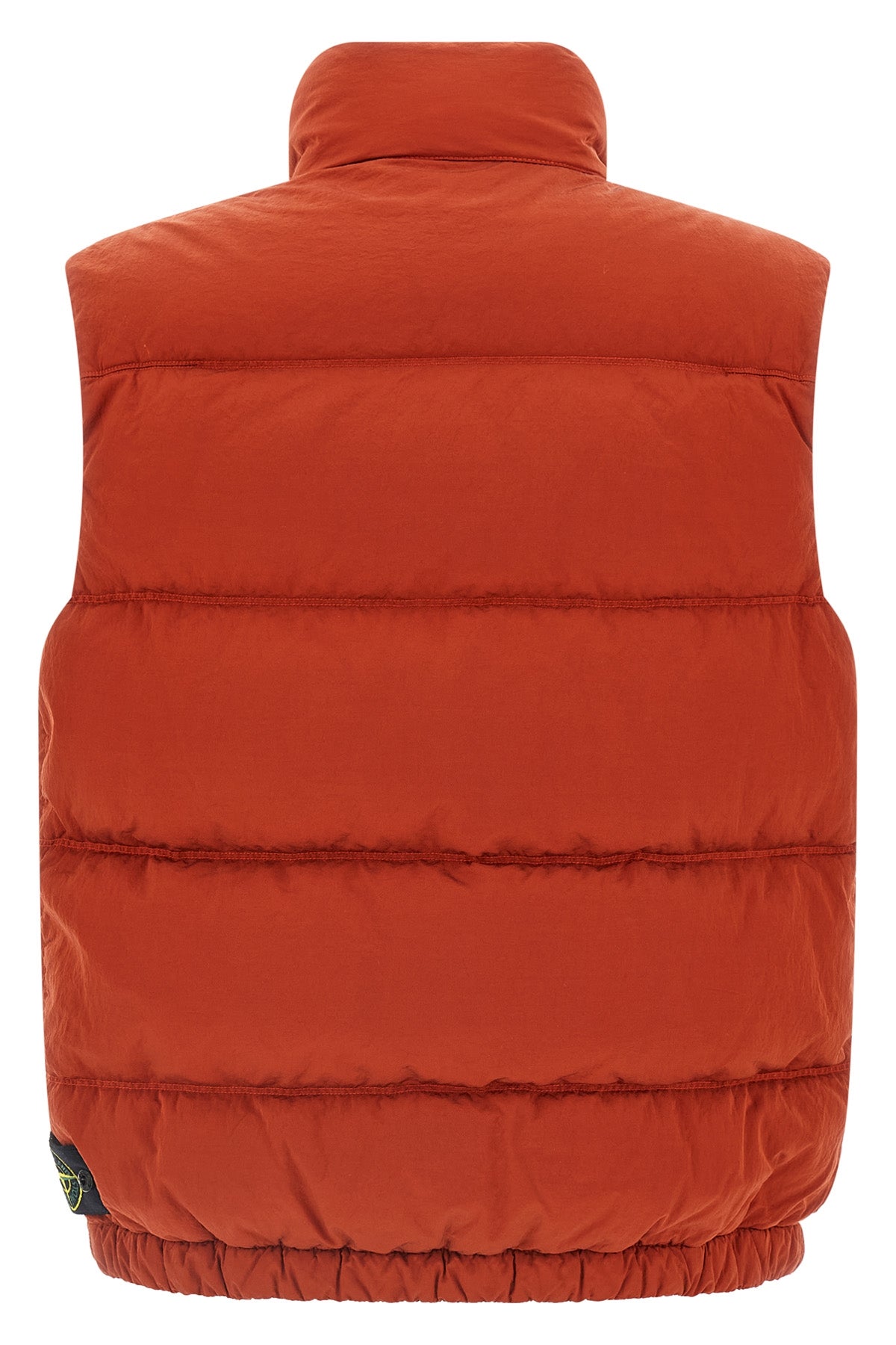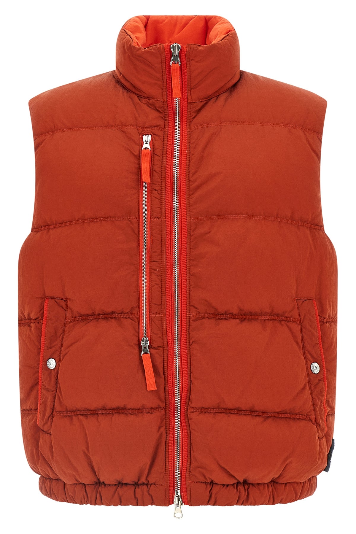 Gilet matelassé et rembourré, col montant, fermeture éclair sur le devant, logo sur le côté, sans manches.