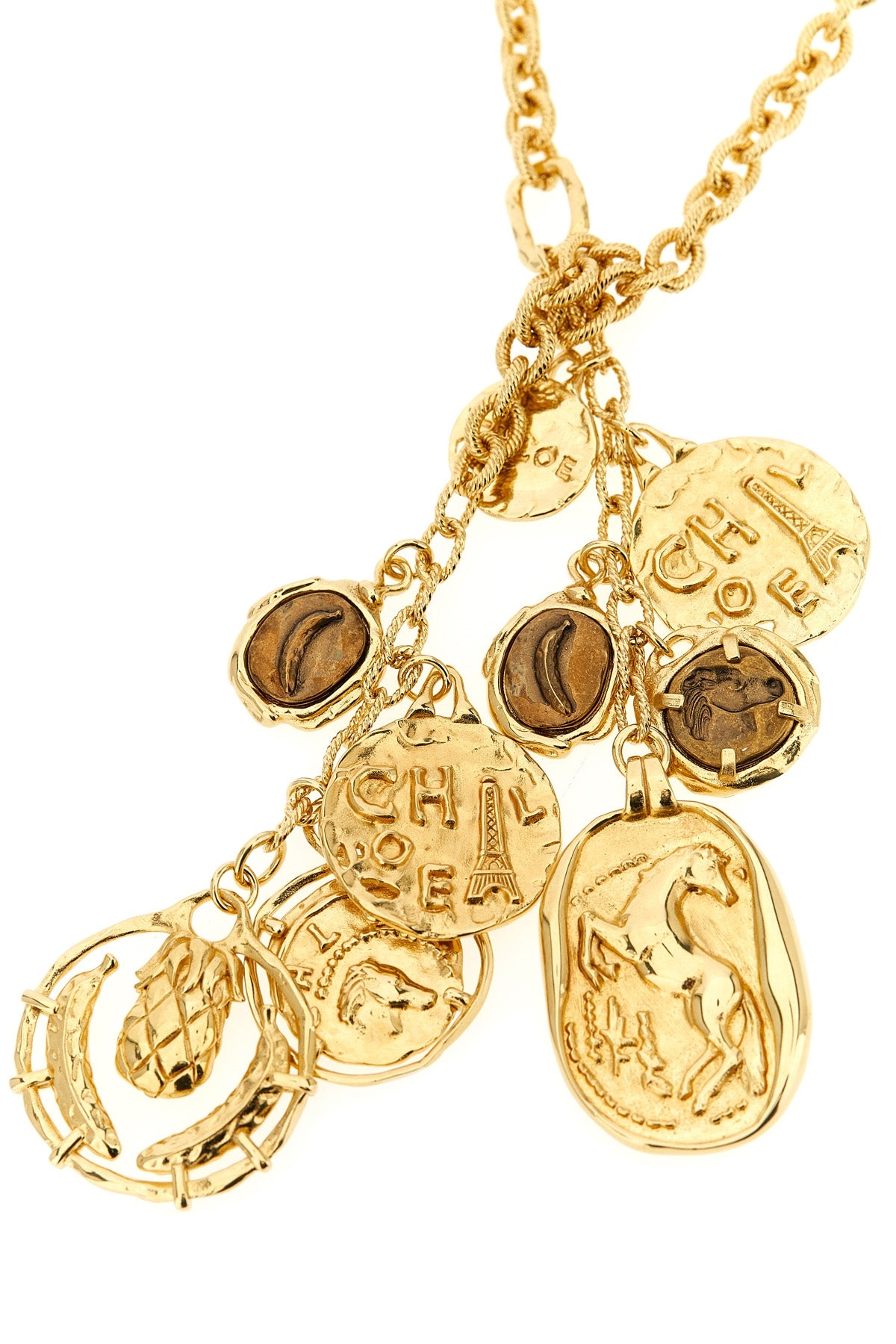 Collier en métal Chloé Medals avec double chaîne et pendentifs ornés de breloques, fermeture par mousqueton.