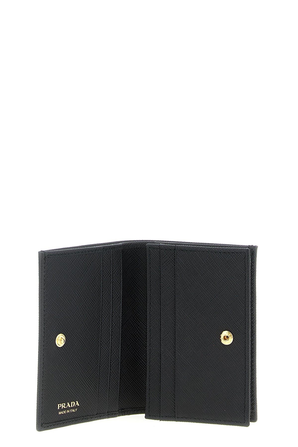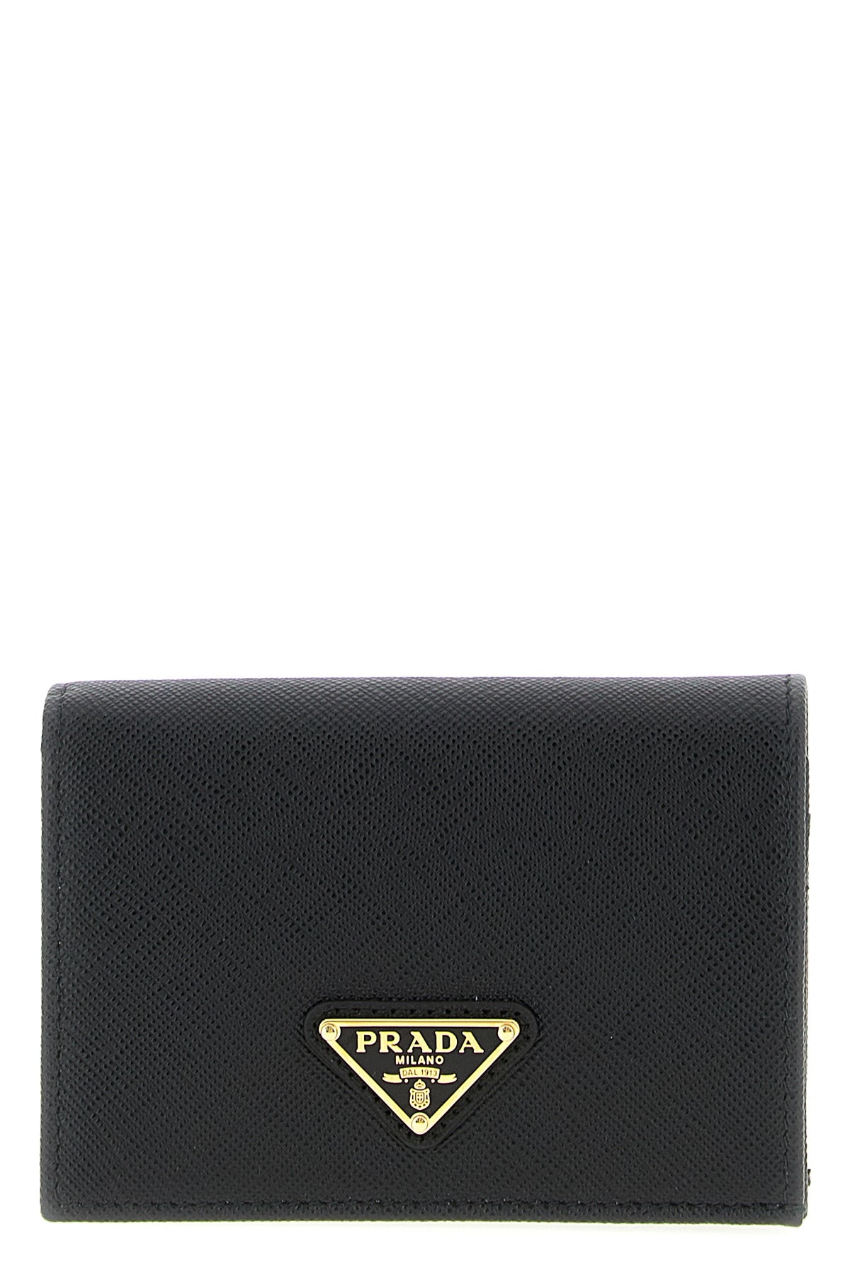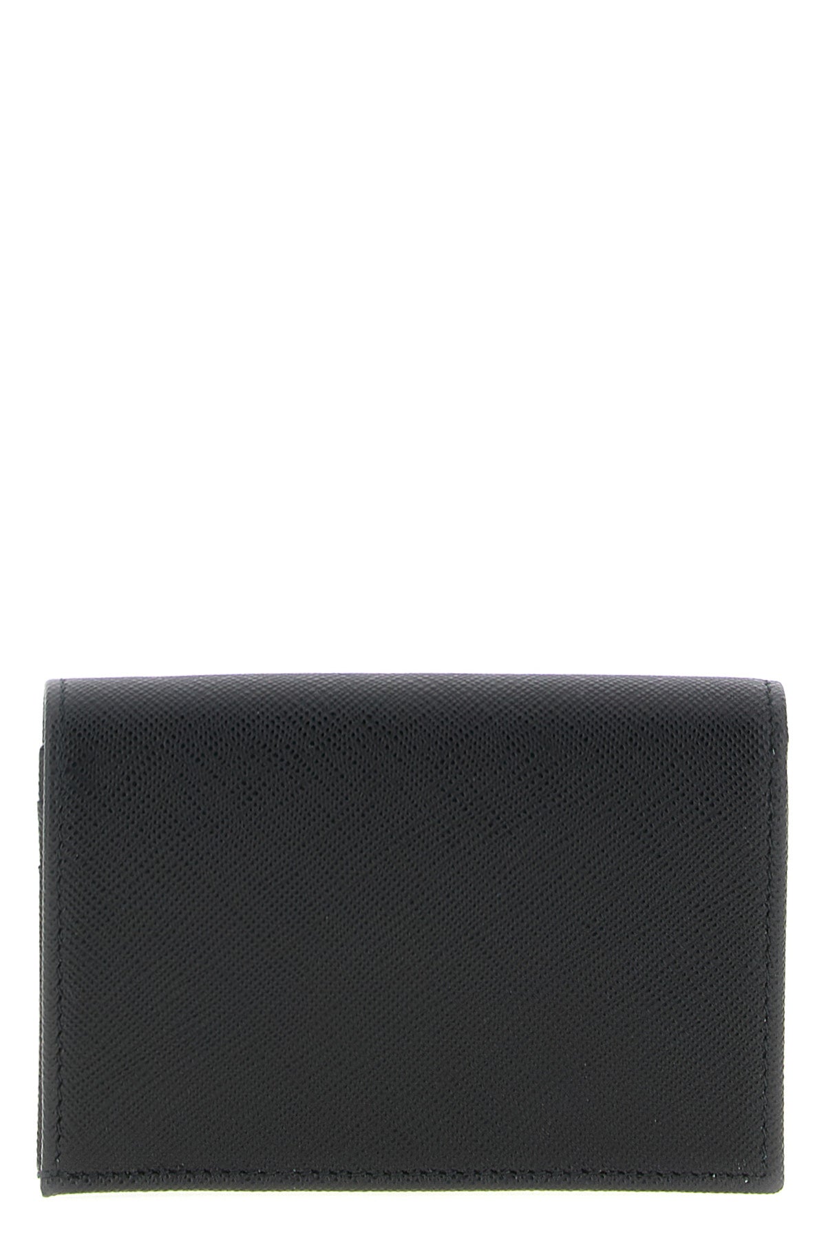 Portefeuille en cuir Saffiano, logo triangulaire en métal émaillé sur le devant, fermeture à rabat avec bouton-pression.
