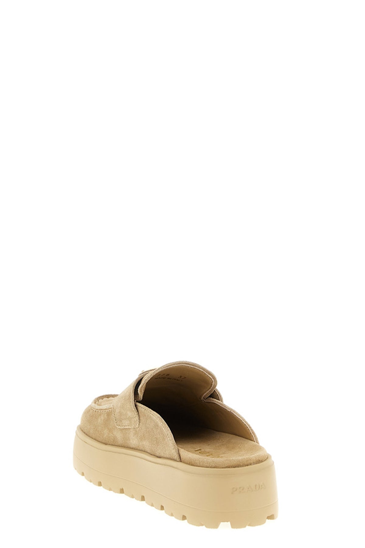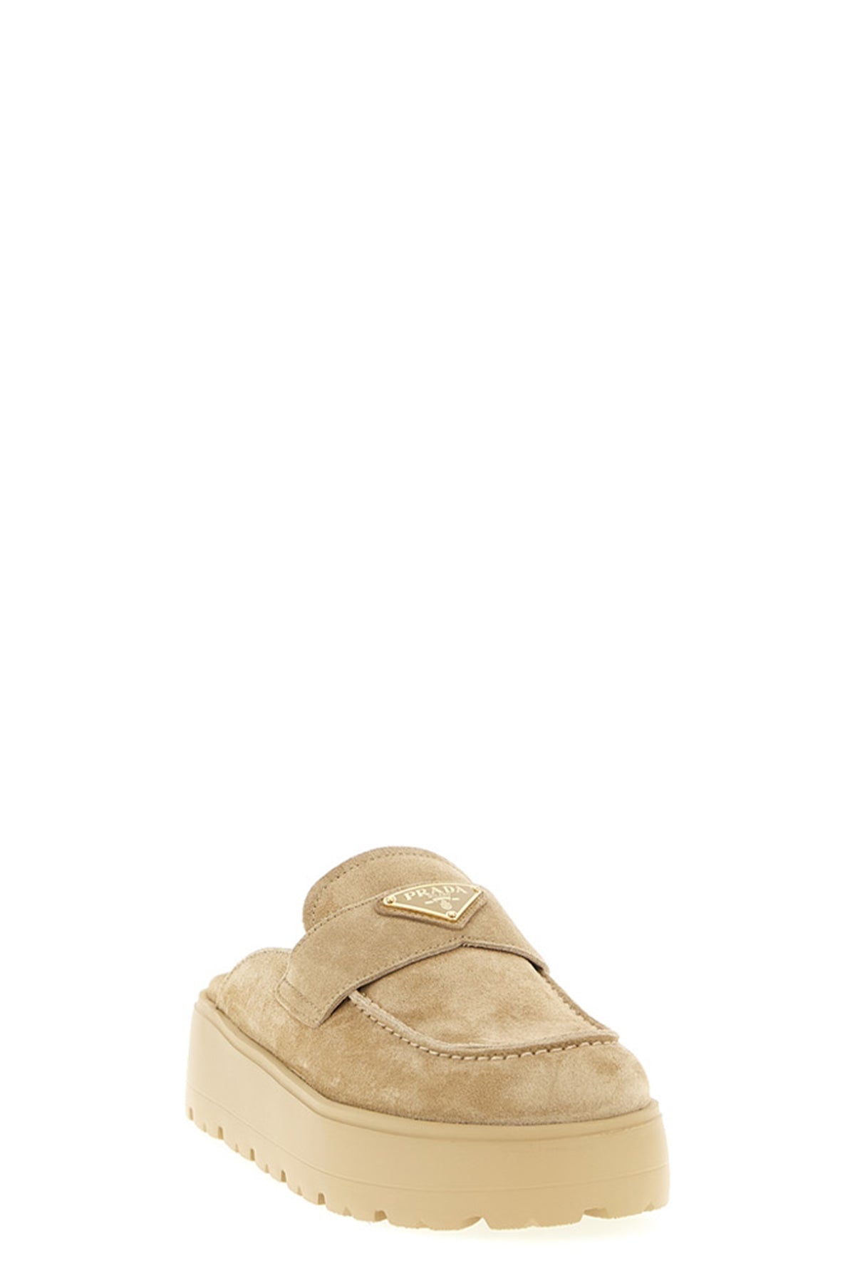 Sabots en daim, logo triangulaire en métal émaillé sur le devant, semelle extérieure surdimensionnée en caoutchouc, semelle crantée avec soufflet.