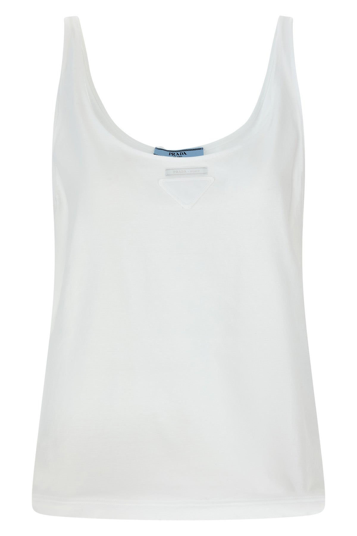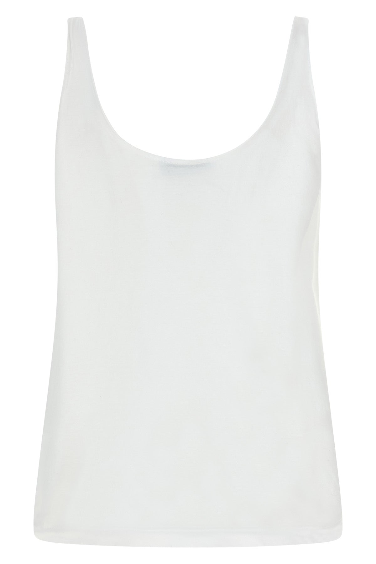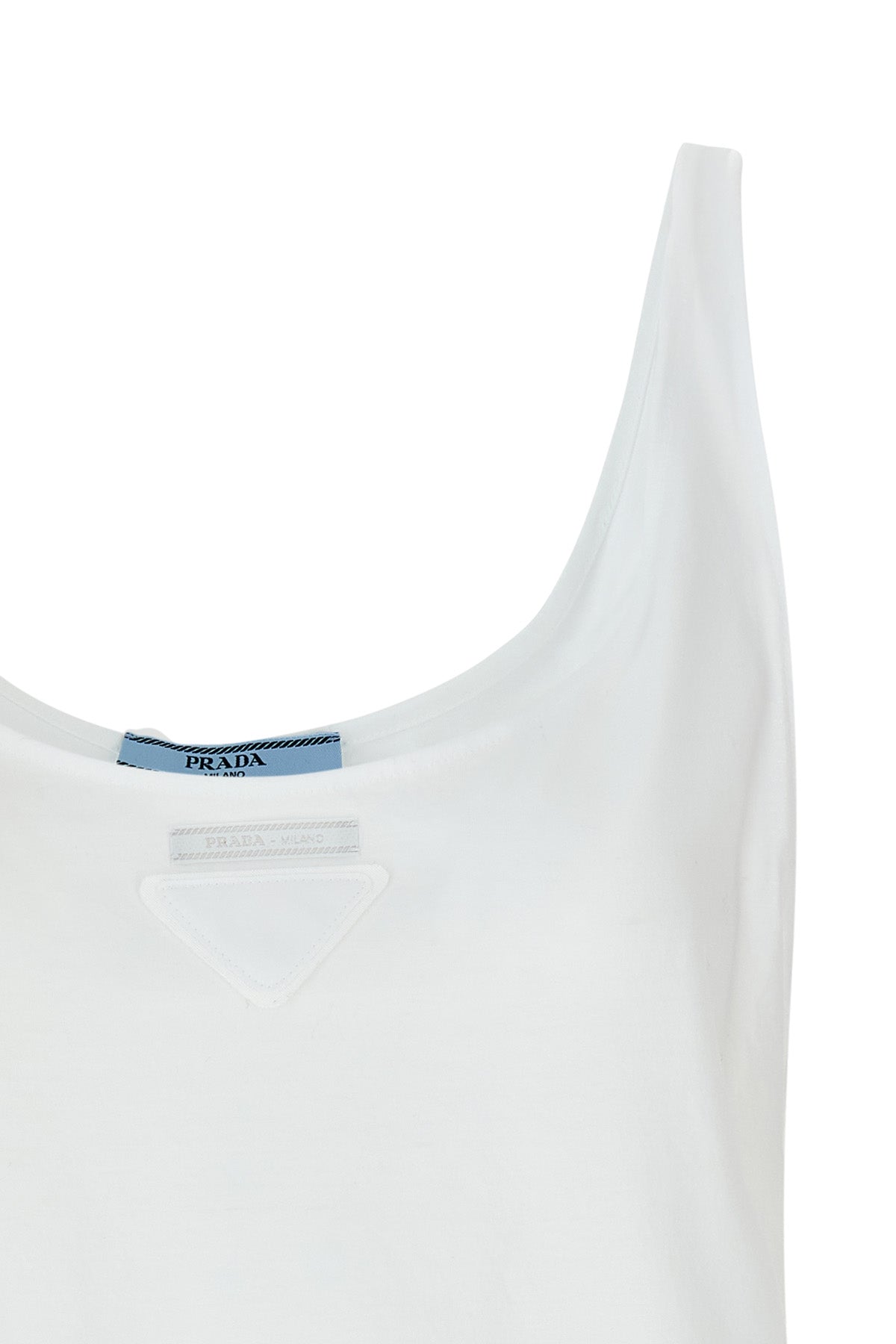 Haut en jersey de coton avec armature métallique dans l'ourlet des bretelles, de l'encolure et de l'ourlet permettant de nombreuses personnalisations, logo triangulaire ton sur ton avec étiquette sur mesure sur le devant, large encolure ronde devant et dos.