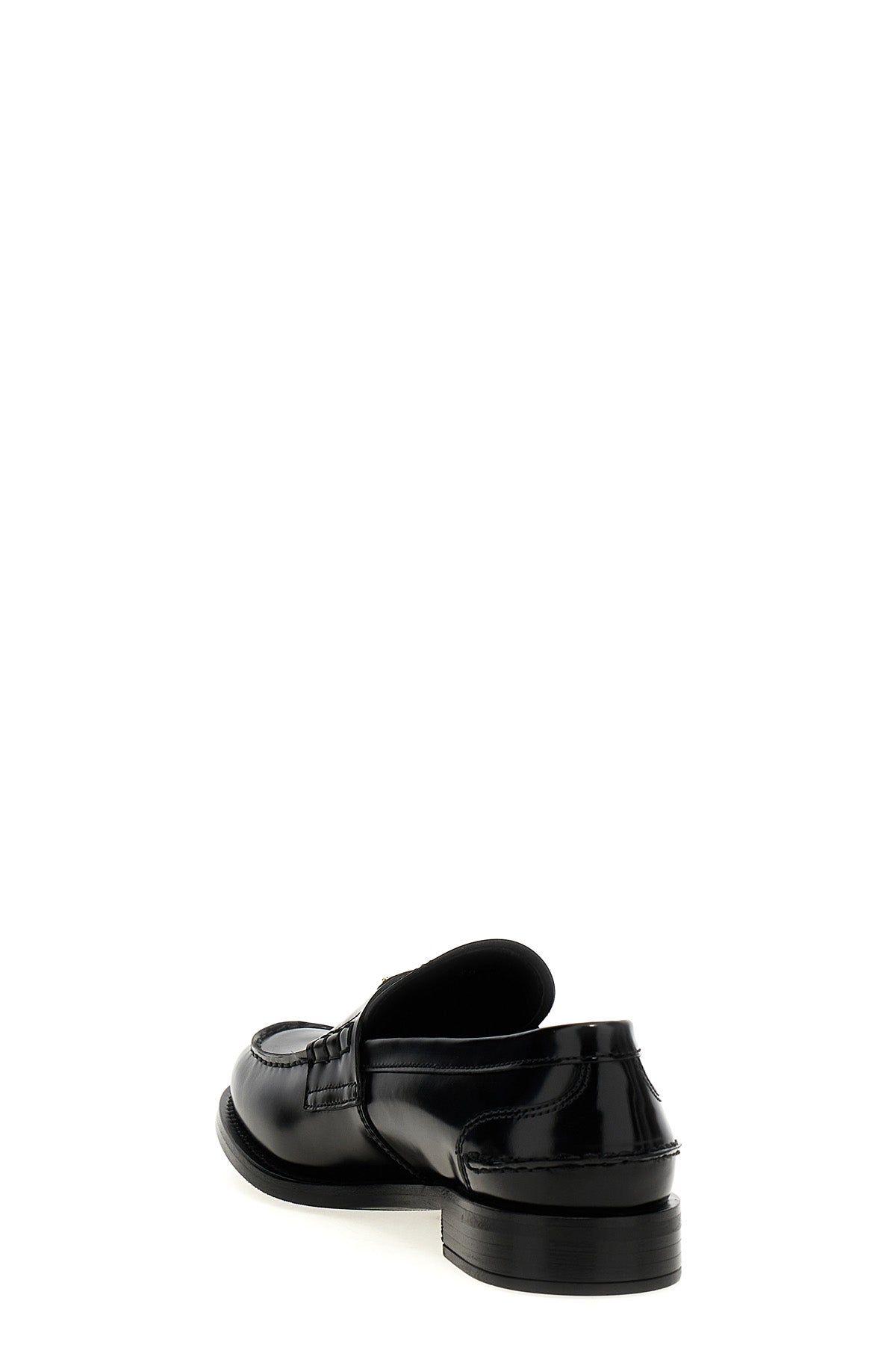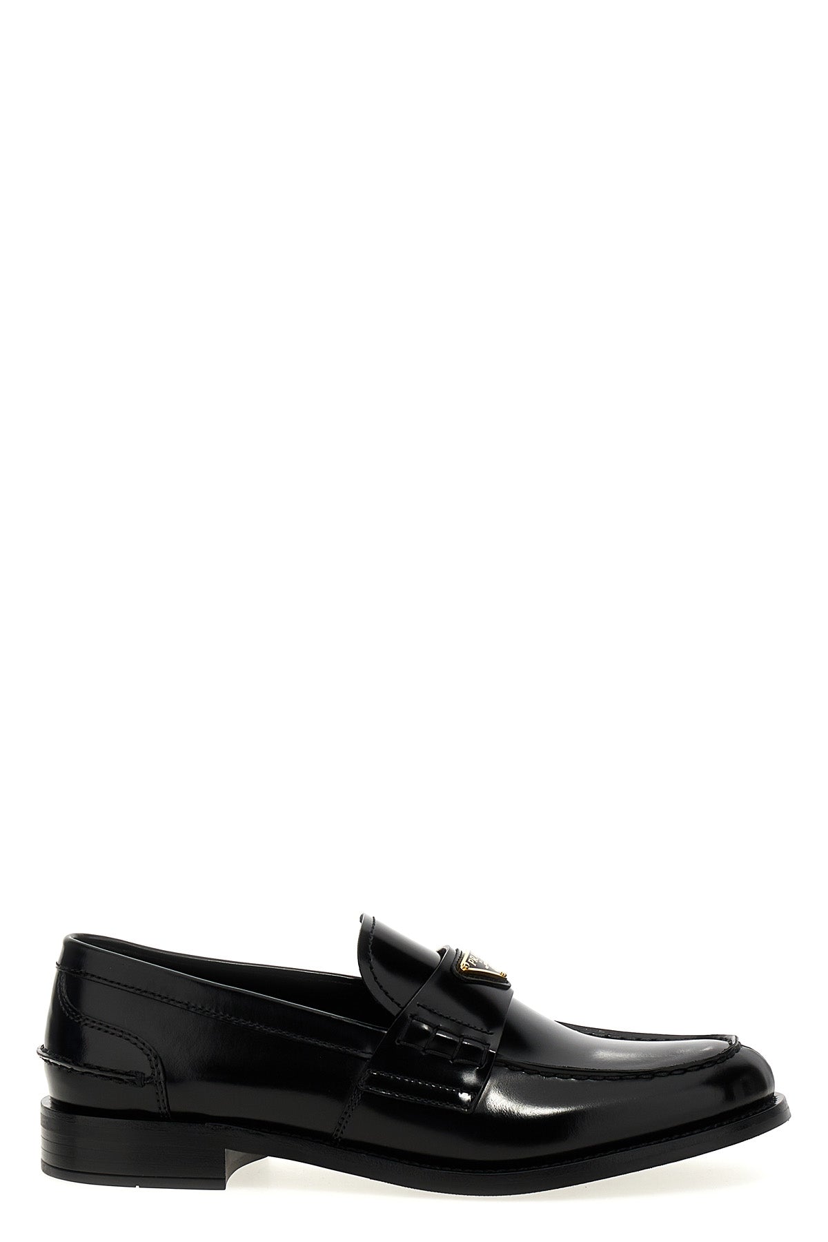 Mocassins en cuir brossé, logo triangulaire en métal émaillé appliqué, semelle en caoutchouc.