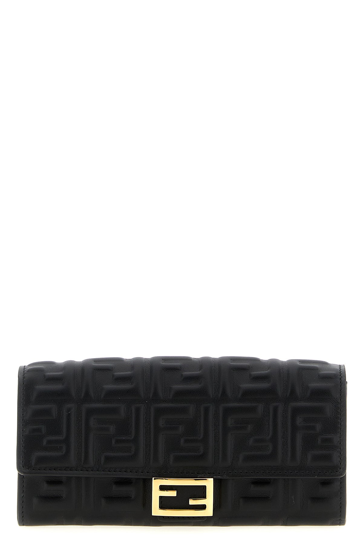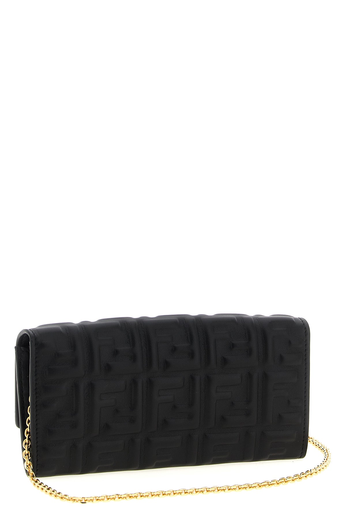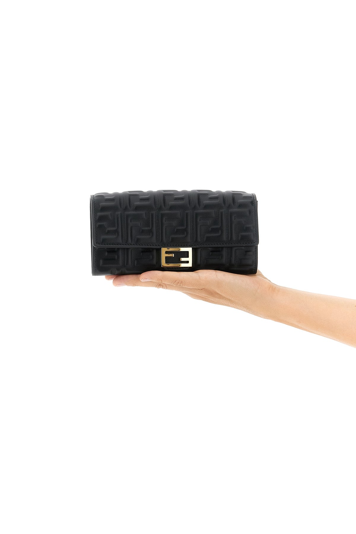 Portefeuille continental Baguette en cuir nappa avec motif F en relief sur toute la surface, bandoulière chaîne fine et amovible, 2 compartiments intérieurs à soufflet, poches zippées, poches plaquées et 10 emplacements pour cartes, et finitions dorées.