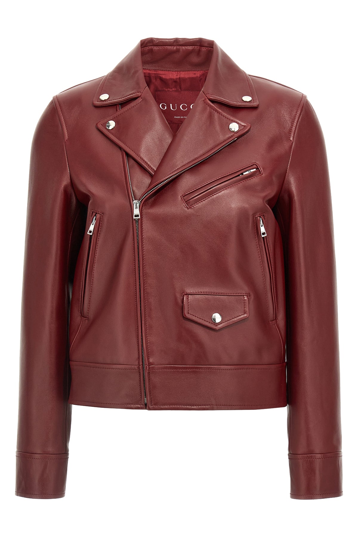 Blouson de motard en cuir, revers pointus, poches à boutons-pression, fermeture éclair asymétrique, manches longues avec fermeture éclair aux poignets et logo en relief au dos.