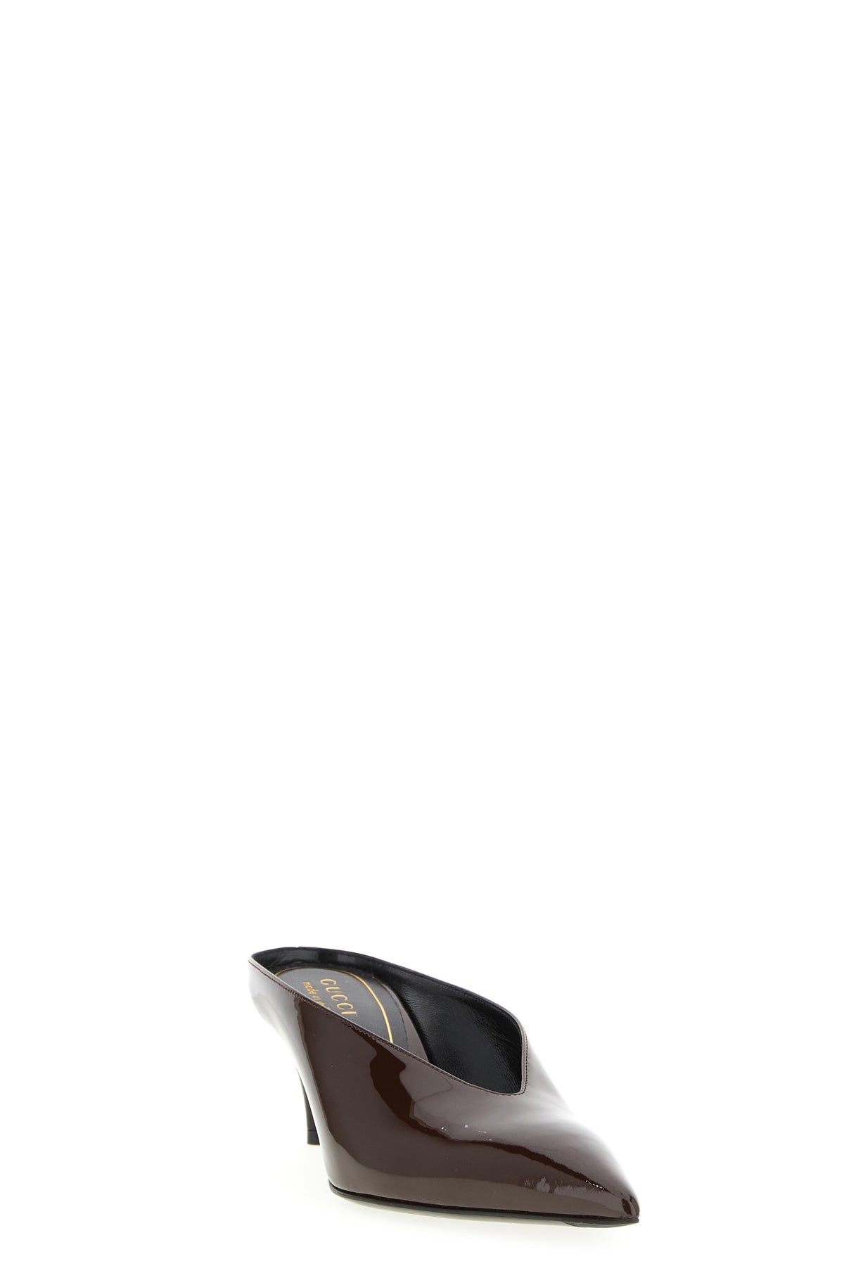 Mules en cuir verni, bout pointu, talon, semelle en cuir.