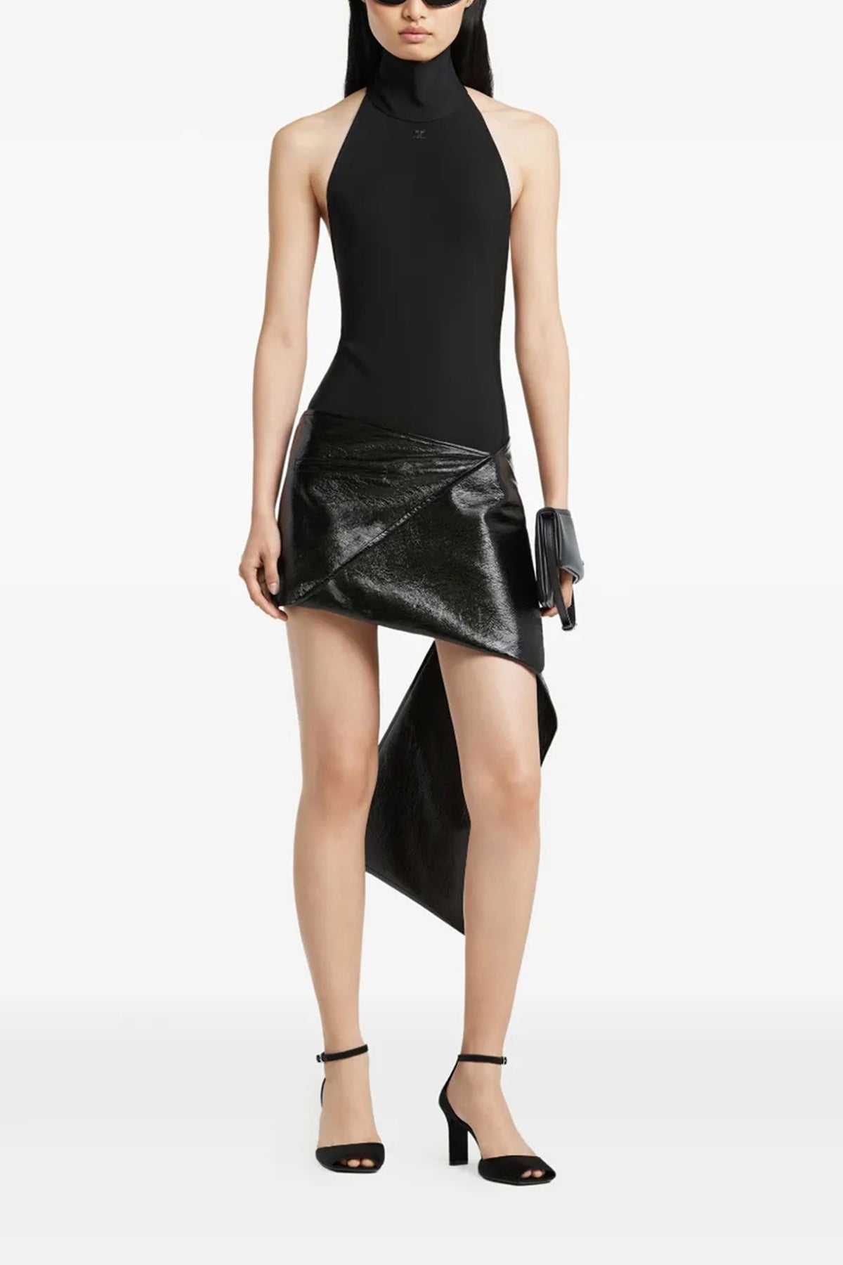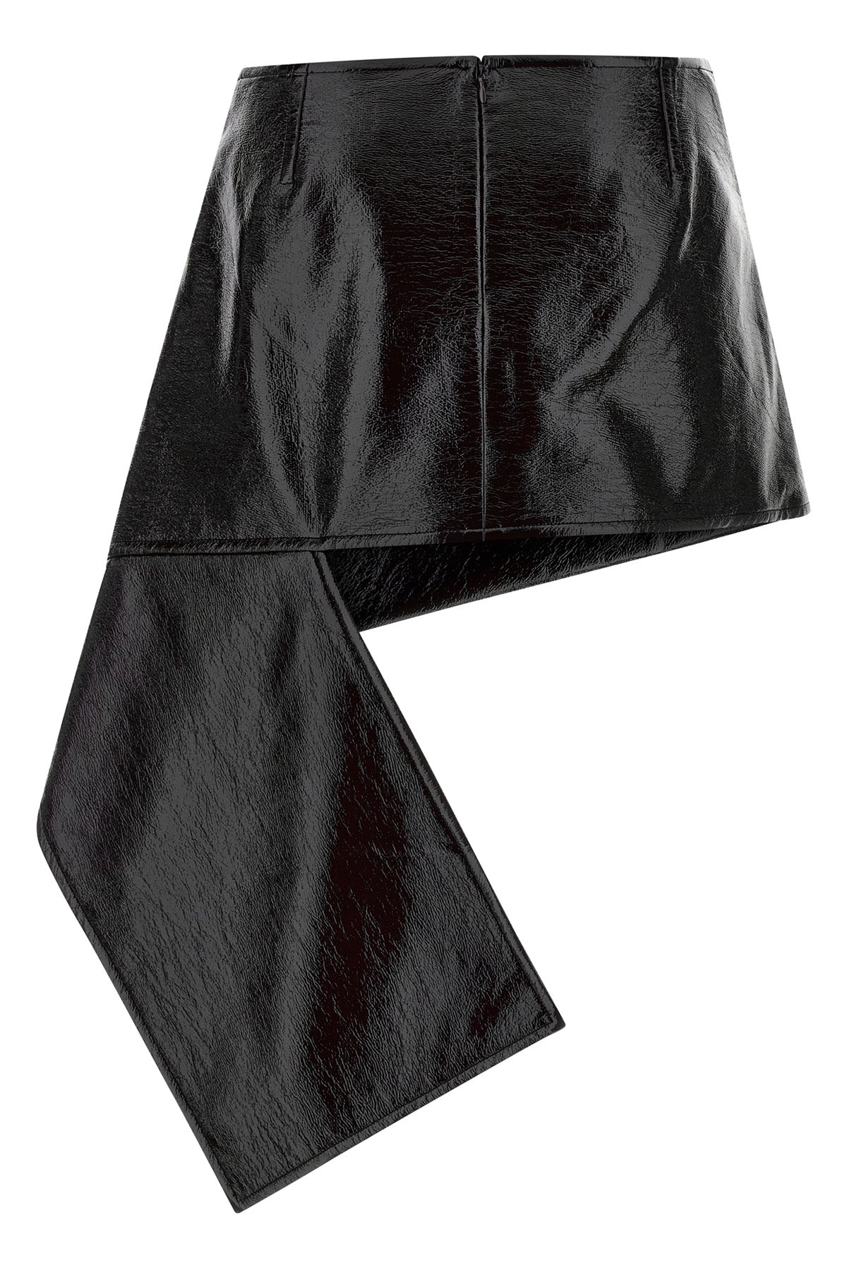Mini-jupe en vinyle pliable, fermeture éclair au dos, poche, ourlet asymétrique avec empiècement arrière descendant le long de la jambe, doublure.