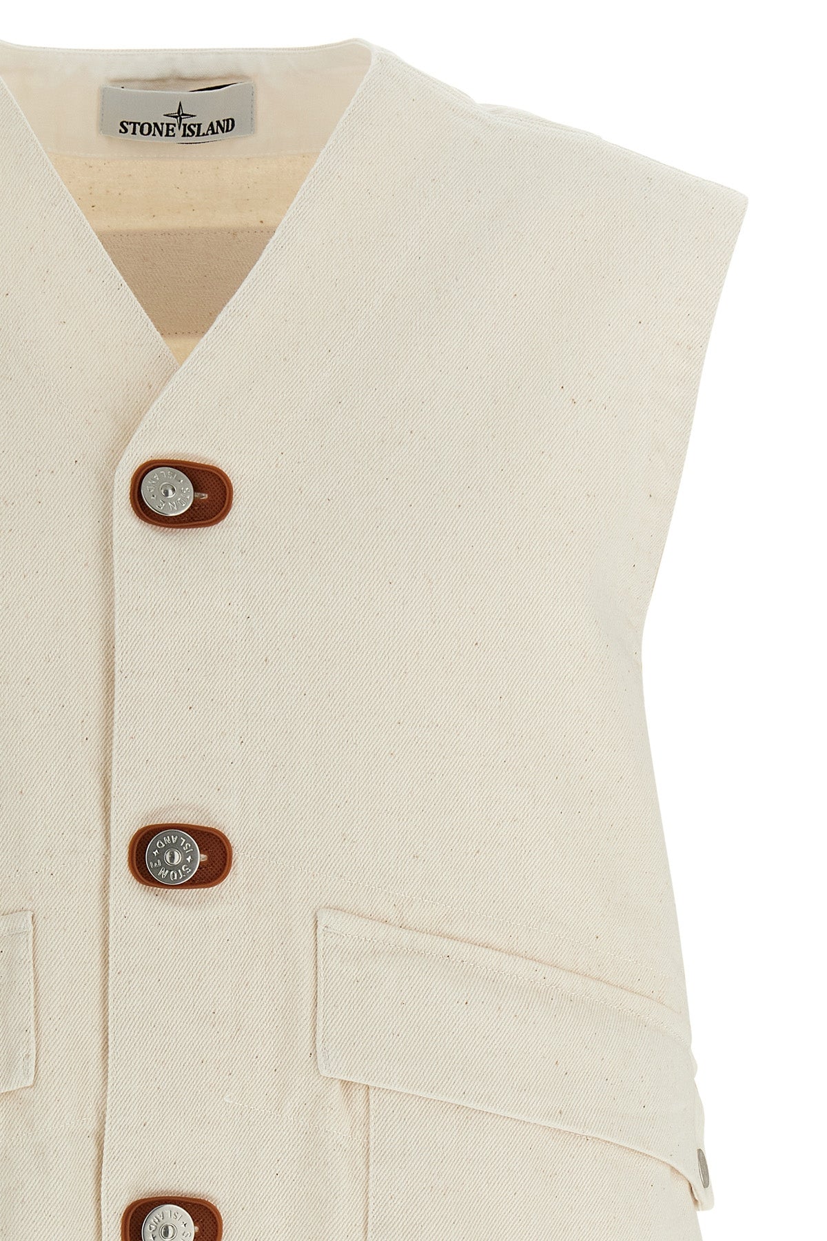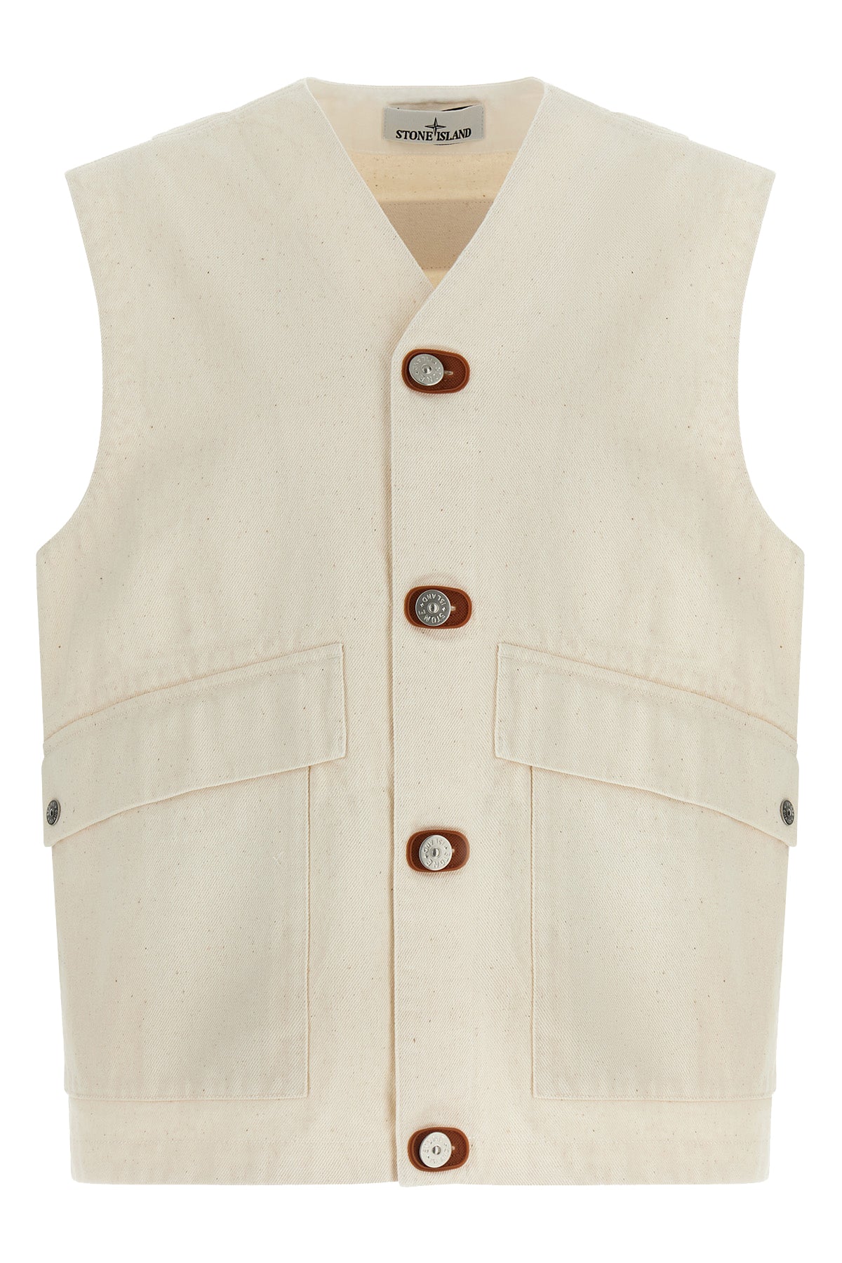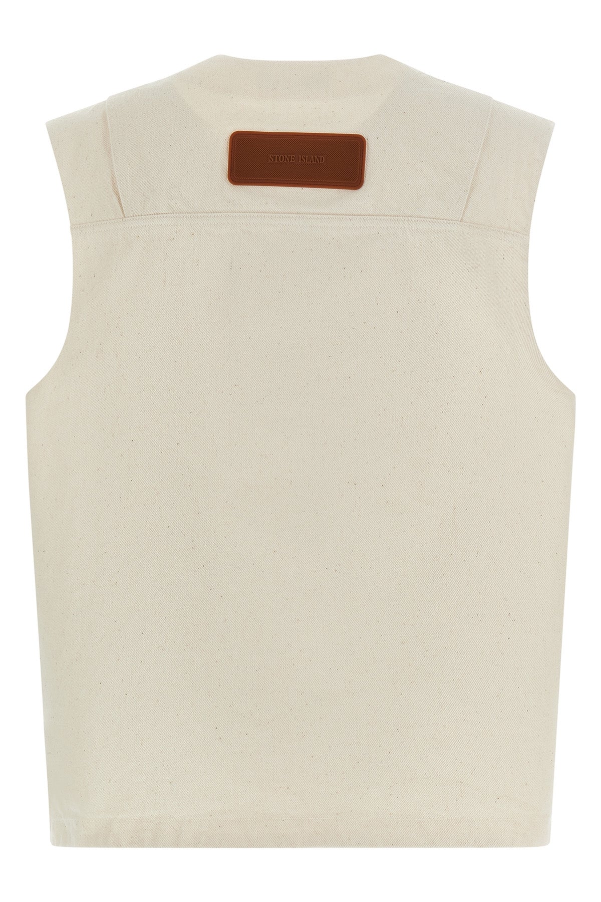 Gilet G100012 en gabardine de coton lavée, col en V, fermeture boutonnée sur le devant, poches, écusson logo en caoutchouc au dos.