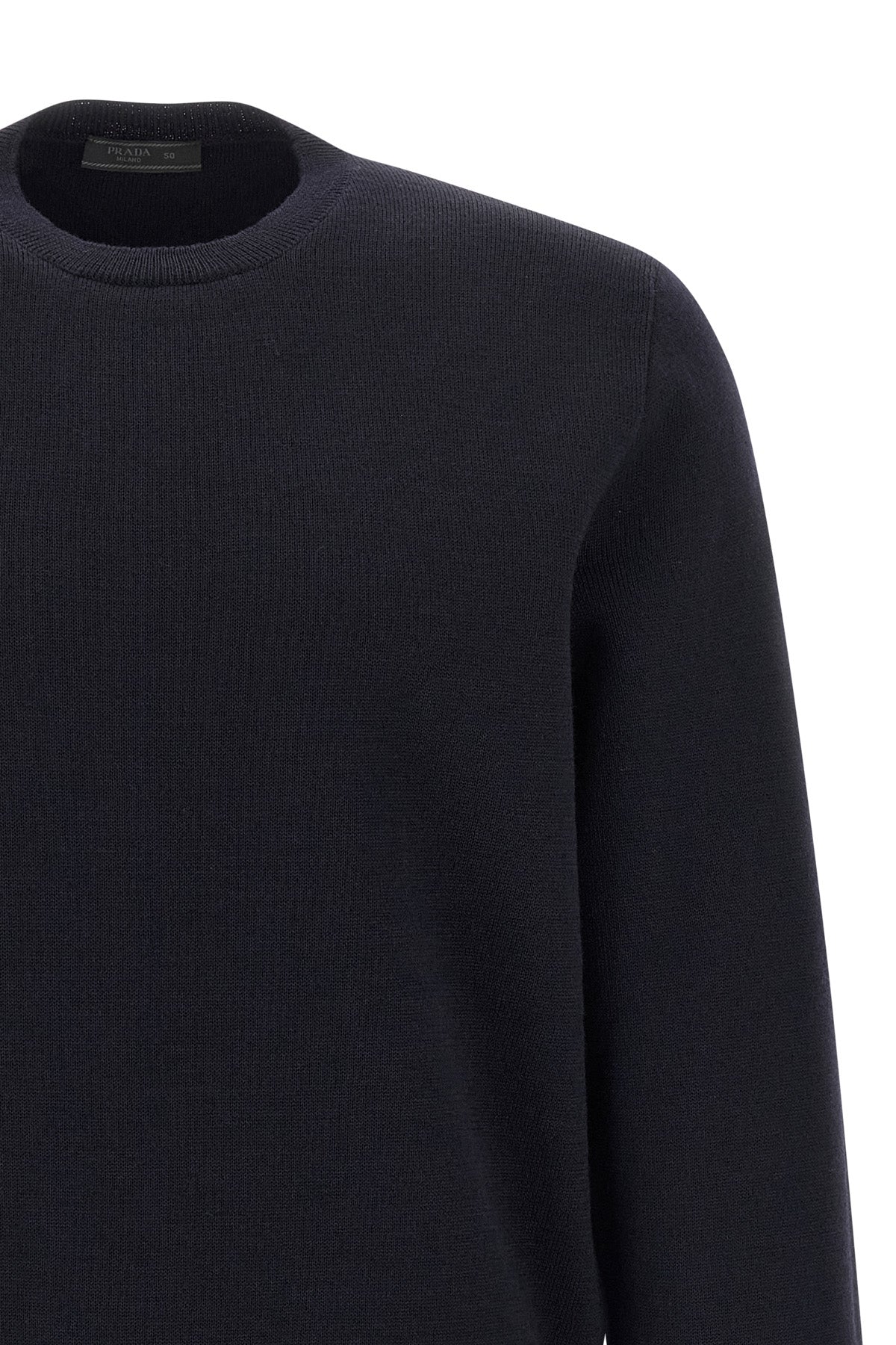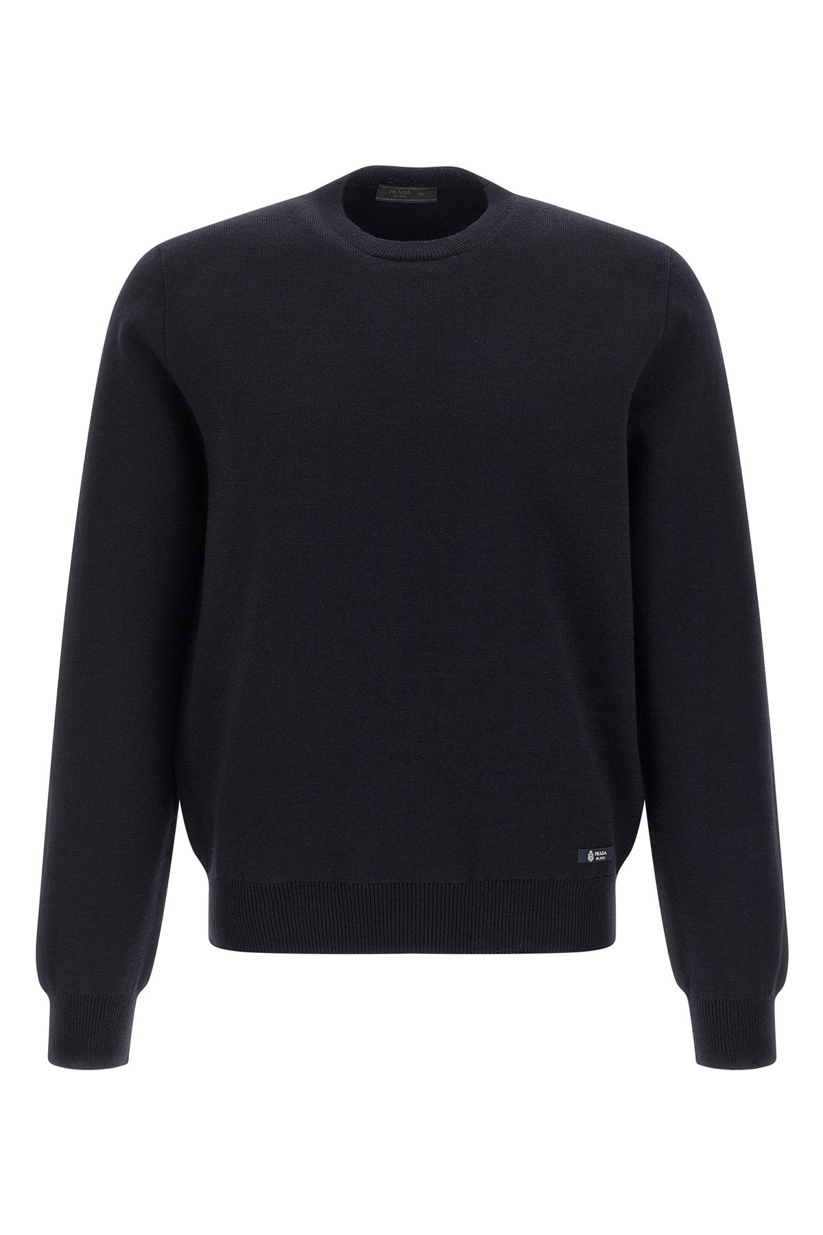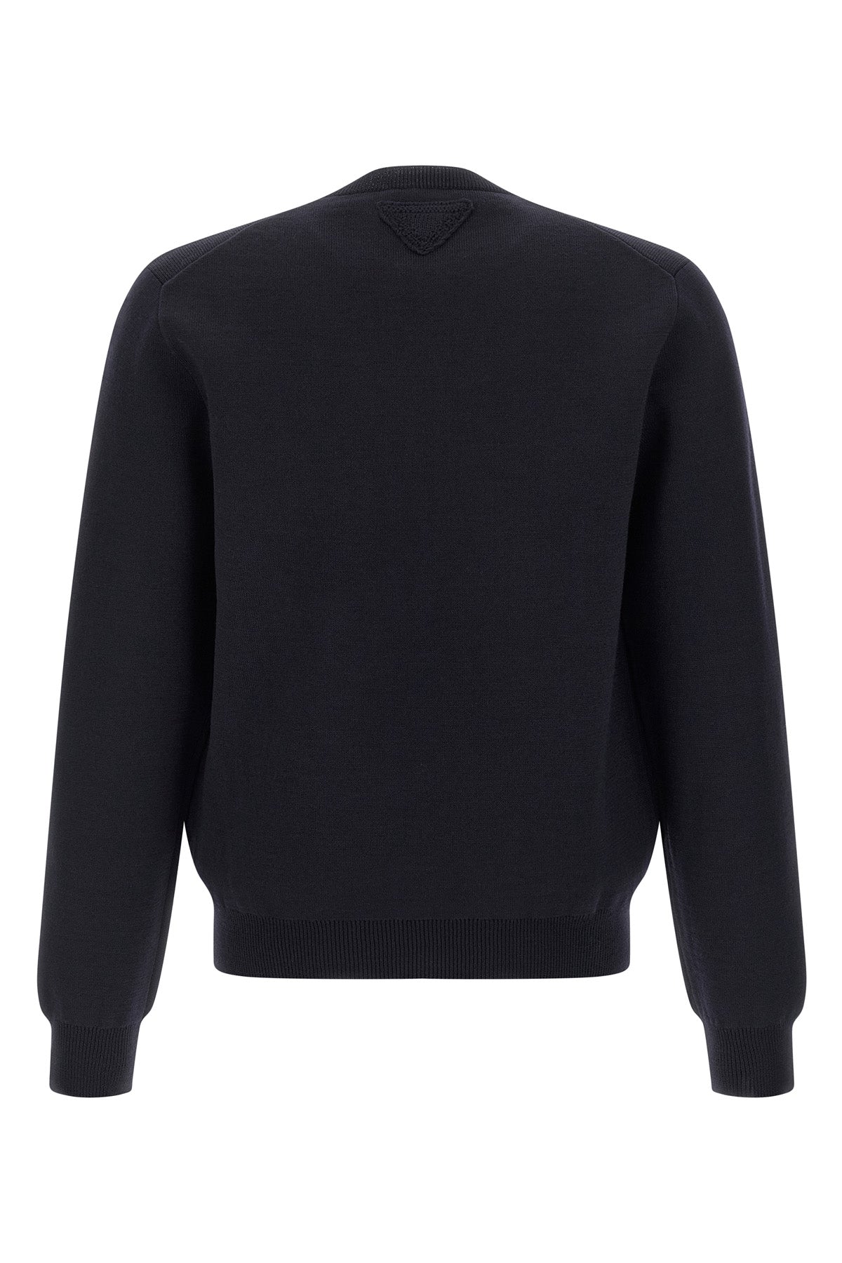 Pull en laine épaisse, col rond, manches longues à poignets boutonnés, écusson logo sur le devant.