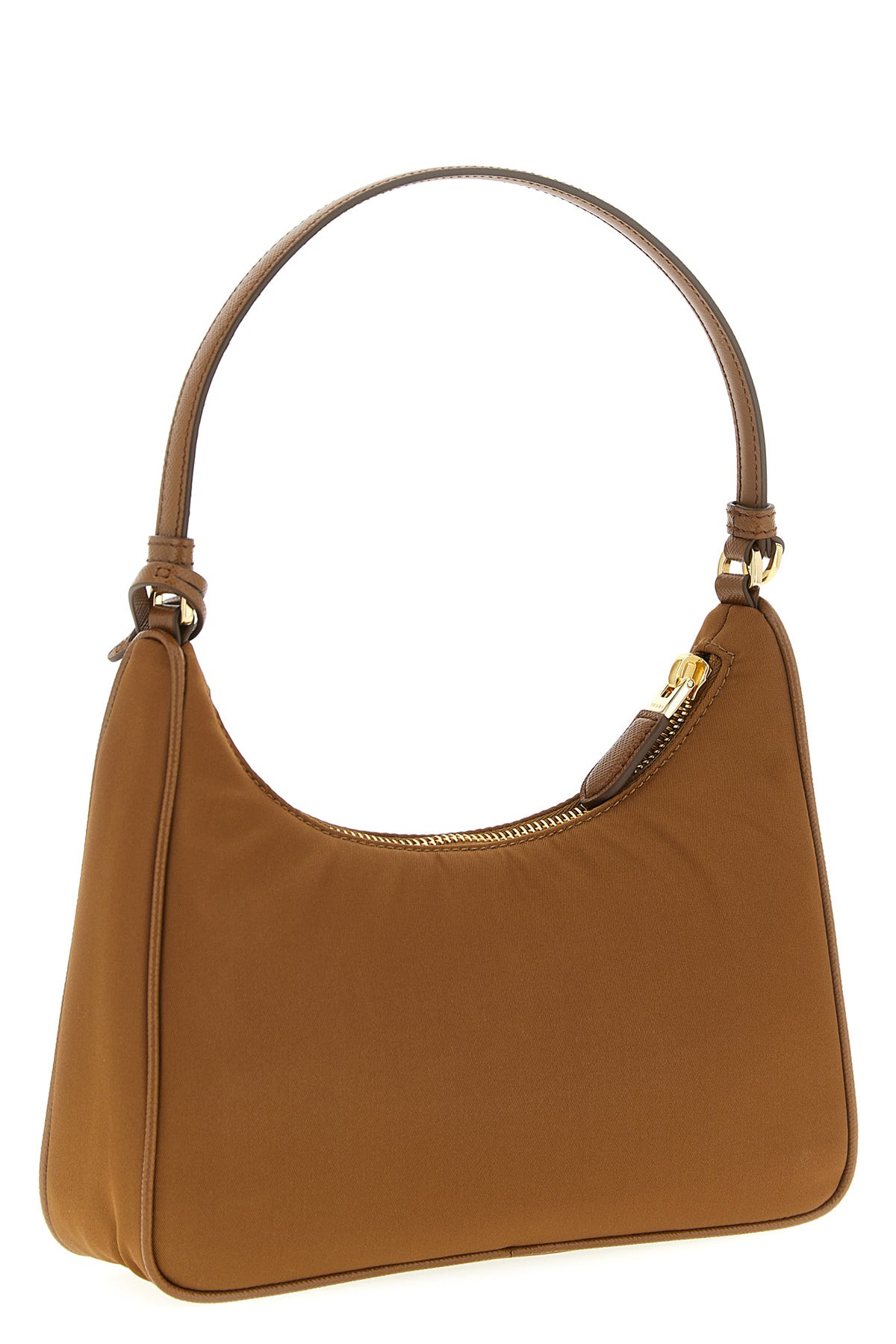 Sac bandoulière Prada Re-Edition 2005 en Re-Nylon et Saffiano, logo triangulaire en métal émaillé sur le devant, fermeture zippée sur le dessus, anse fixe, porte-clés recouvert de cuir.