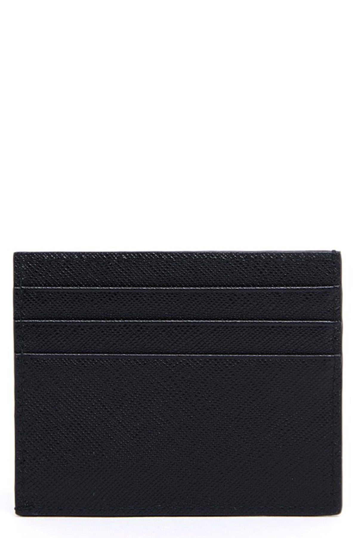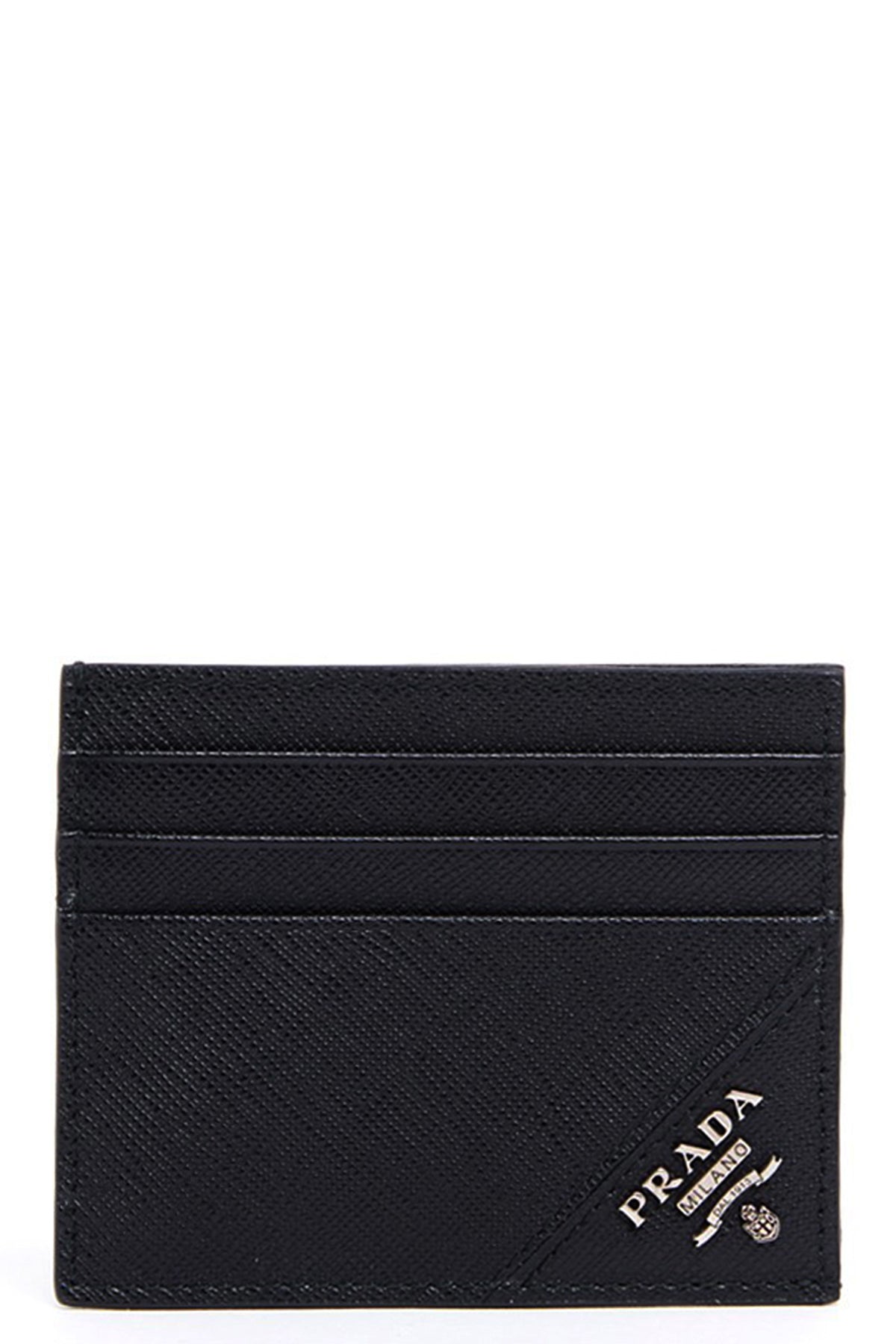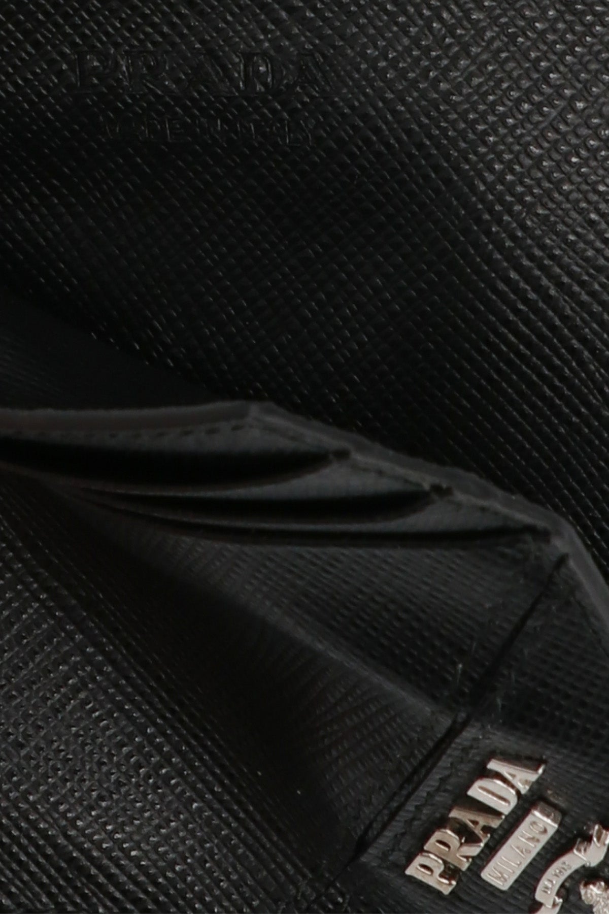 Porte-cartes Prada en cuir Saffiano avec logo triangulaire.