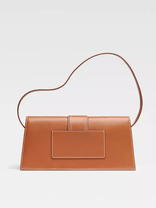 Le Le Bambino Long signé Jacquemus incarne parfaitement l’élégance minimaliste et la sophistication contemporaine de la maison française. Confectionné en cuir lisse marron, ce sac séduit par ses lignes allongées et structurées, sublimées par le logo doré Jacquemus sur le devant.