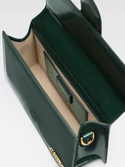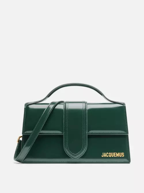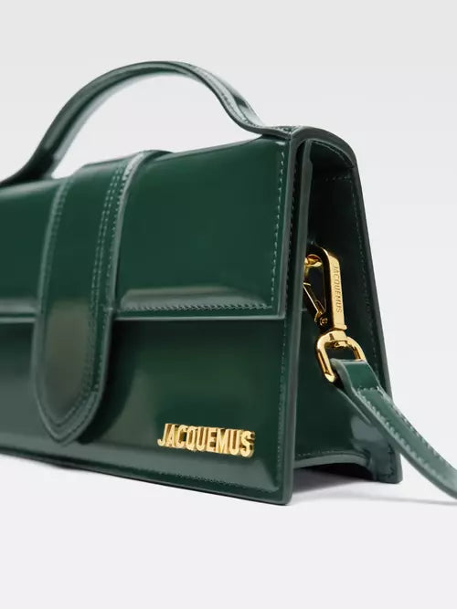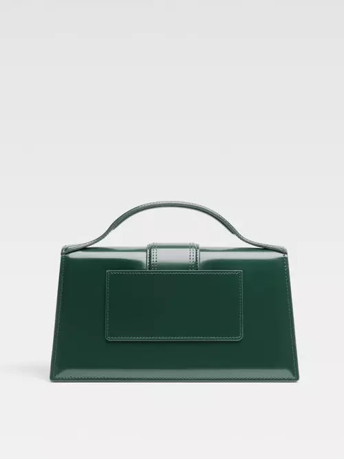 Le Le Grand Bambino de Jacquemus revisite l’élégance intemporelle avec une touche contemporaine. Confectionné en cuir lisse vert foncé, ce sac structuré séduit par son design rectangulaire raffiné et son logo doré Jacquemus emblématique sur le devant.